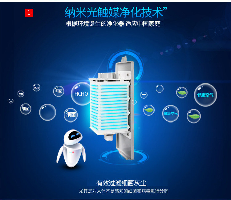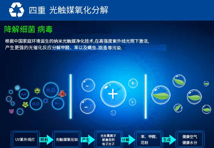 • 工作原理:活性炭 负离子 HEPA技术 紫外线 光触媒