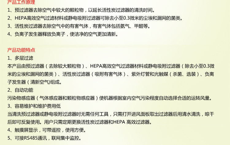 T系列包含预过滤器、HEPA高效过滤器、活性炭过滤器、UFCO常温催化氧化甲醛模块、紫外灯消毒、光触媒。