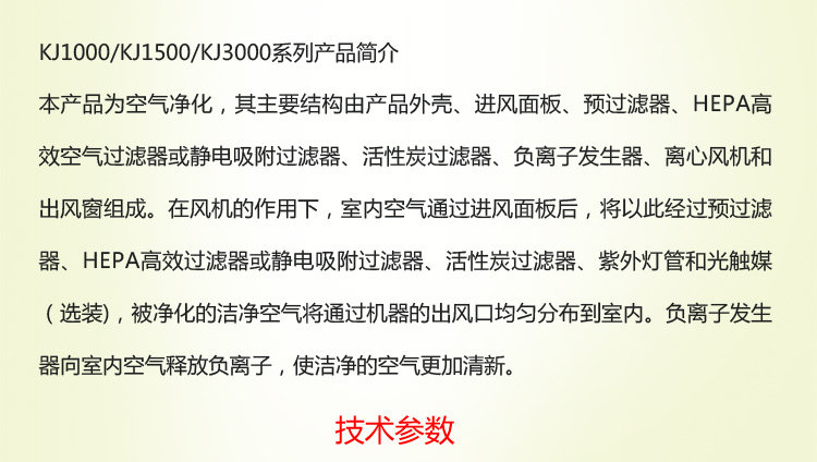 J系列包含预过滤器、高压静电吸附装置、活性炭过滤器、光触媒、紫外灯消毒。(静电吸附装置无需更换,可清洗循环使用)清洗预过滤器,静电吸附装置或更换活性炭装置时不需要任何工具,更换、清洗方便。