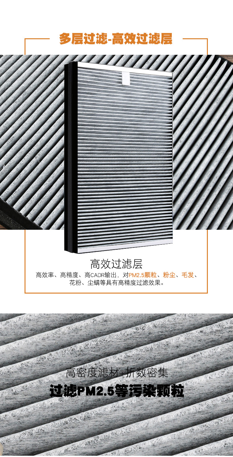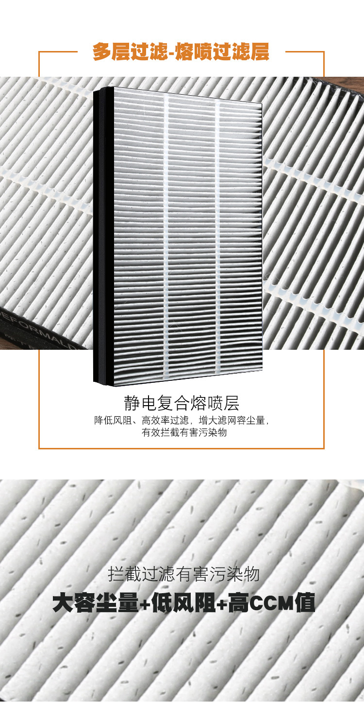 多效合一复合滤网,过滤雾霾、甲醛、苯等污染物。
