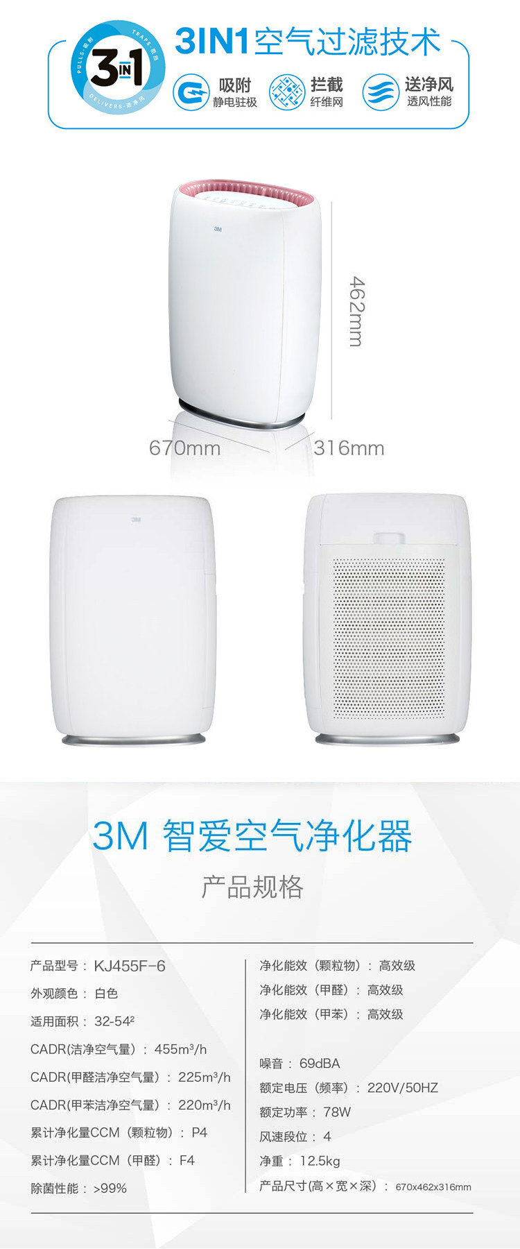 3M空气净化器新款KJ455F-6除雾霾PM2.5净化器家用办公棋牌室氧吧