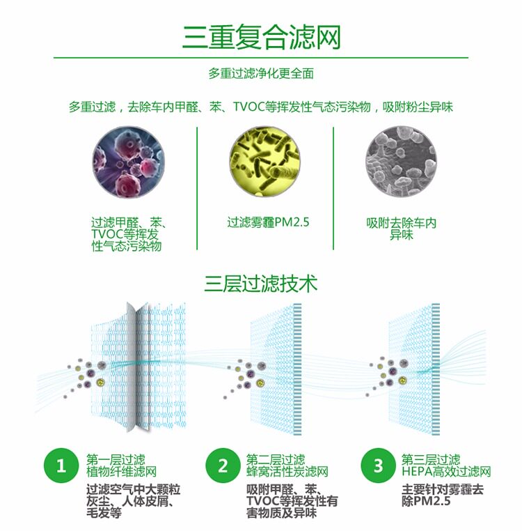 • 功能:消除异味 过滤灰尘 吸收TVOC气体