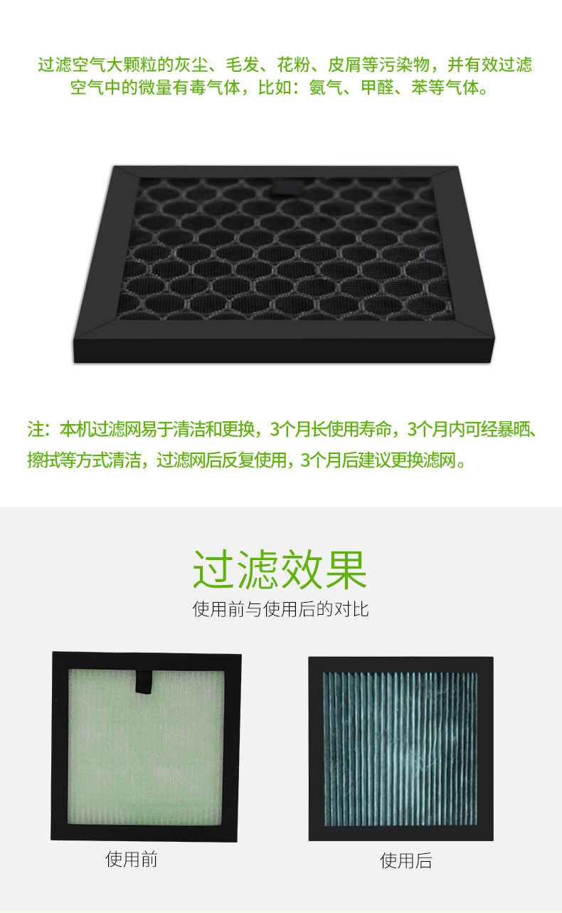 • 功能:消除异味 过滤灰尘 吸收TVOC气体