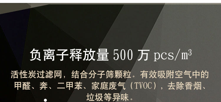 • 功能:除花粉 除颗粒物 除烟除尘 除菌, 负离子