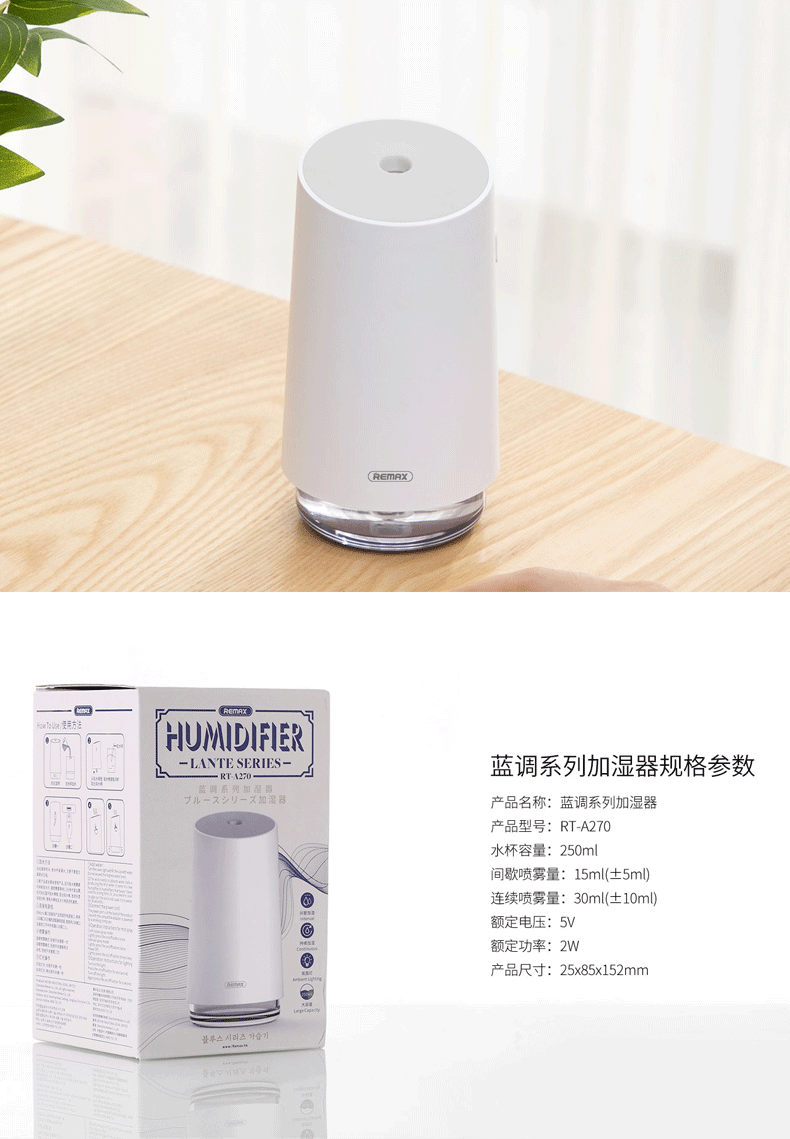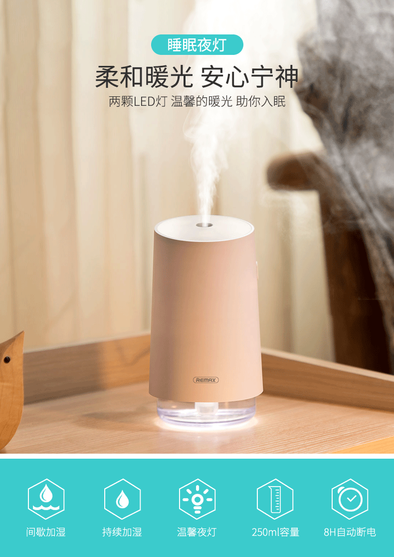 remax 加湿器家用静音卧室孕妇氧吧婴儿小型净化空气迷你湿化器房间简约usb办公室空调除螨杀菌学生宿舍用女
