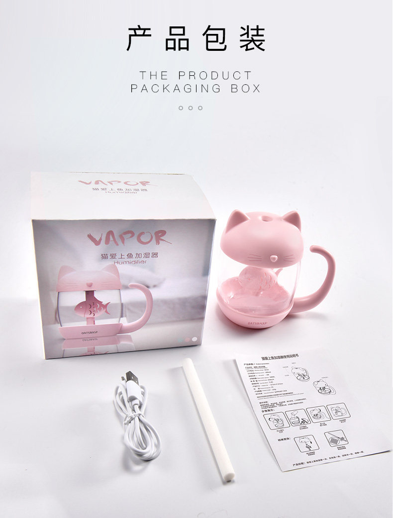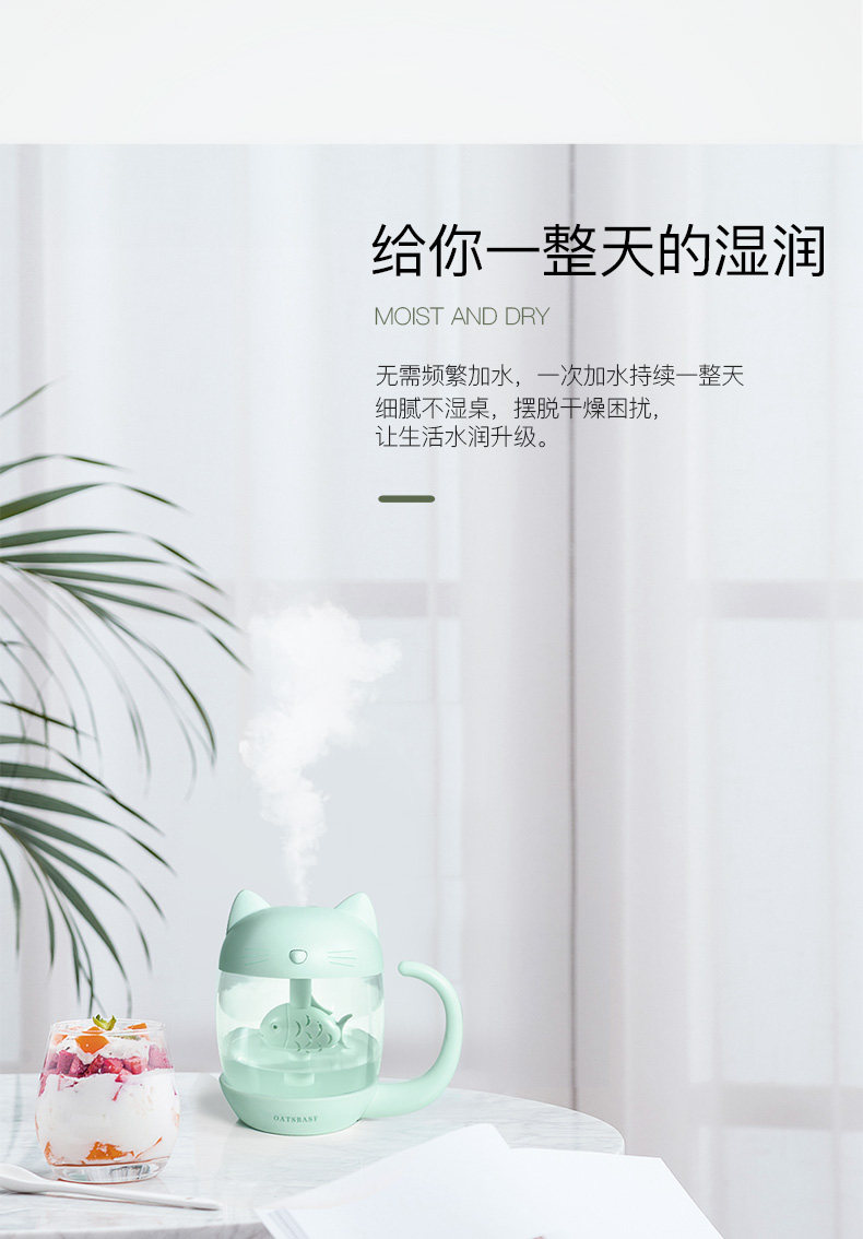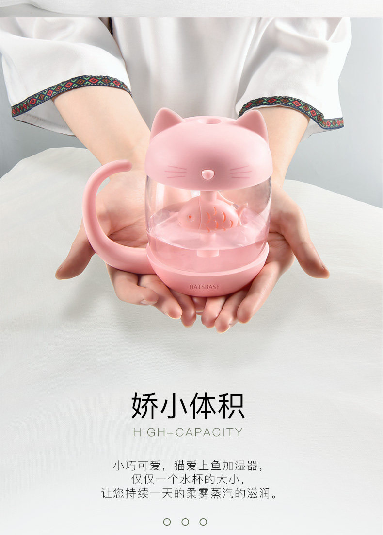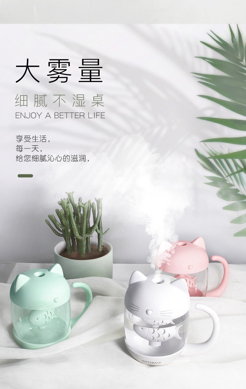 用了一段时间,来评价下。加湿器收到 包装很精美,没有破损,质量也不错呢,秋天皮肤比较干燥, 放一个小小的加湿器在房间里既不占地方又能很好的加湿环境,不错 小身材大用处呢 喷的雾很细腻。没有杂音。而且小猫咪的造型的超可爱。颜色也很漂亮,小小的很喜欢!操作简单,拿到就用上了,很漂亮的。