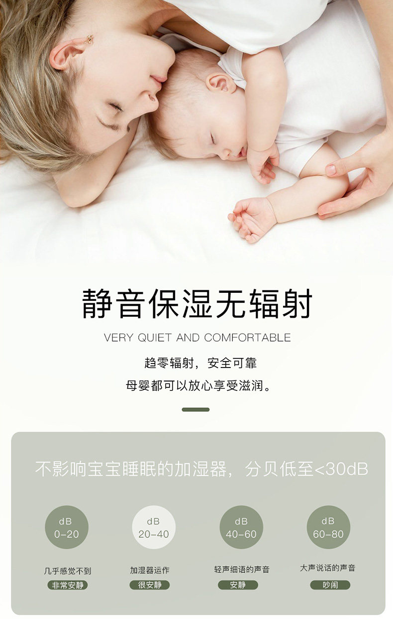 这个加湿器超可爱,开启后没听到什么声音,静音感棒棒哒。而且这个加湿器外观也超级可爱,很简约精致,喷出来雾很大 ,还有彩色灯光切换着亮。怕白色不耐脏,换薄荷绿,挺不错的,晚上使用的时候也没有声音,是静音。毛啥噪音,睡得很香。