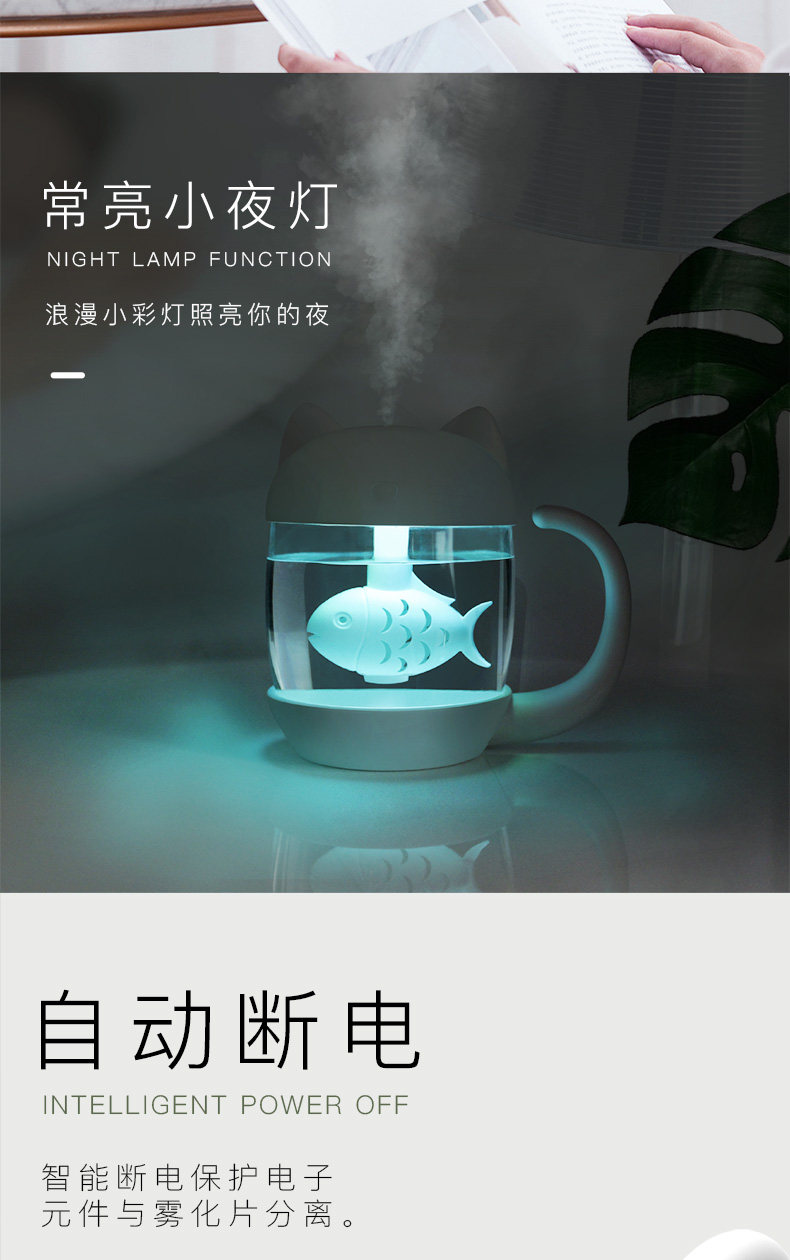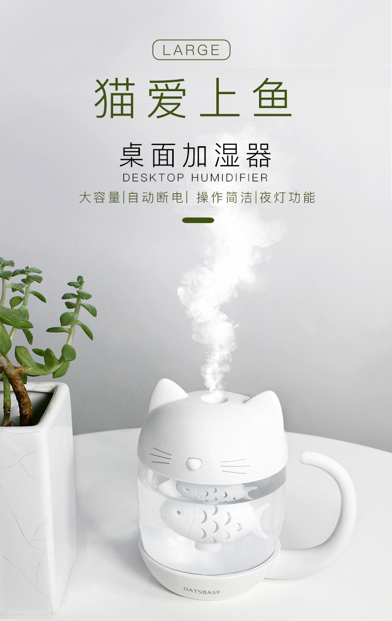 转季了,天气变得有些干燥,所以朋友就介绍我来买这个来给女儿用用,这款加湿器颜值挺高的,鱼在猫的肚子里,也是萌萌的,喷的雾挺大的,而且挺细腻的,也没有噪音,价钱也不贵,性价比挺高的,女儿很喜欢,可开心了,看着雾气感觉能看一天她。