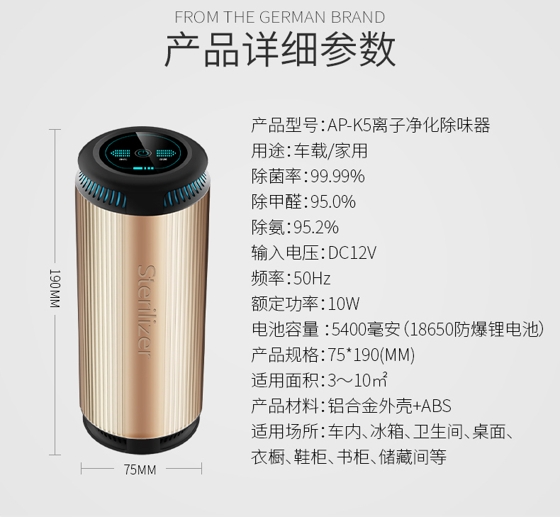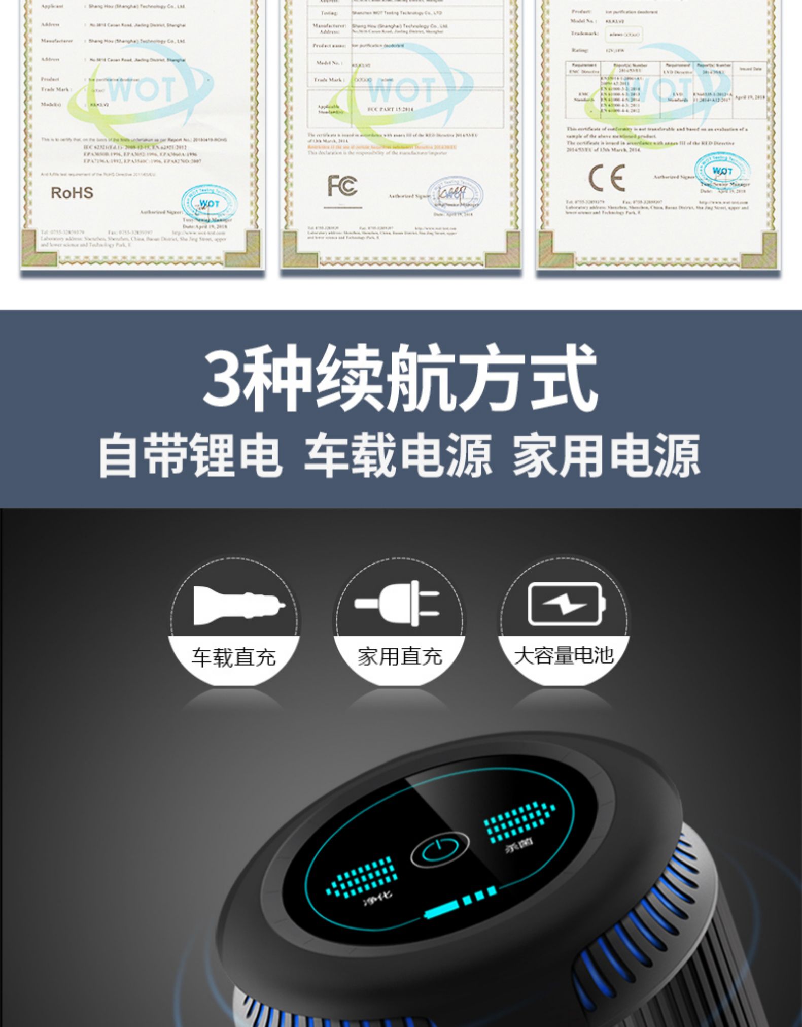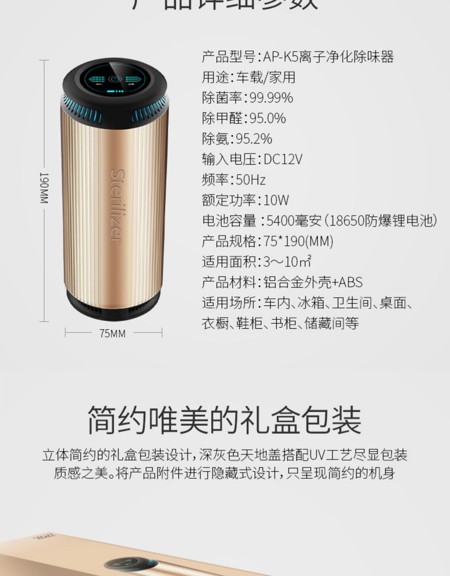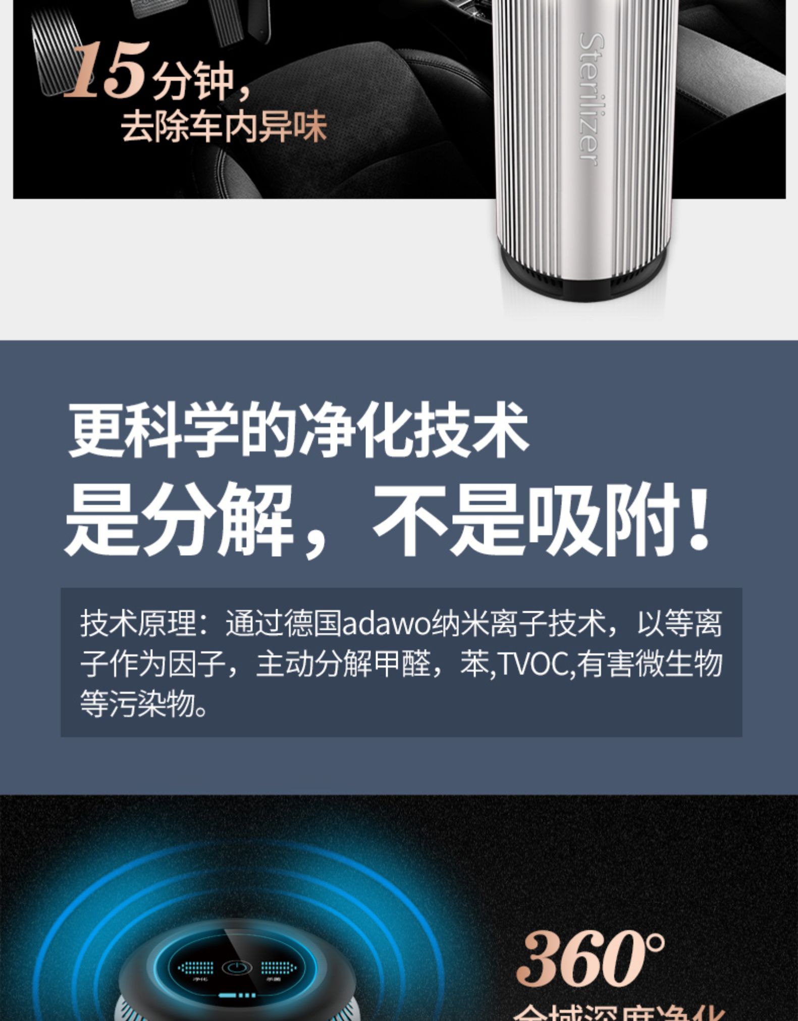 刚刚收到,开箱检查,发现完全没有电。现充现试机。宝贝分量很足,插上车载点烟器,亲点开关键,显示蓝色指示灯为净化空气模式,有呼呼的吹风声。噪音不算大,如果在启动车的状态下,此声音可以忽略不计。长按开关键立马指示灯显示橘红色为杀菌模式。感觉杀菌除臭的效果来的更直观点,随即关机。进一步的体验后再追评一下。