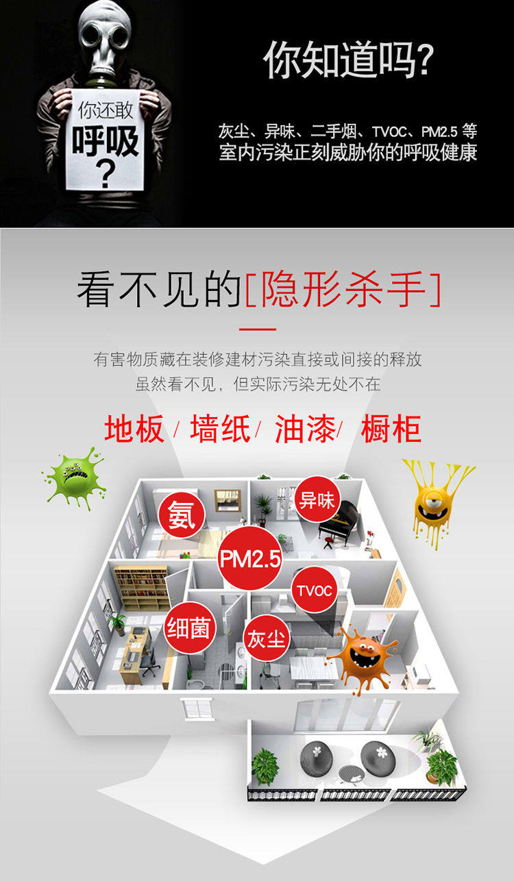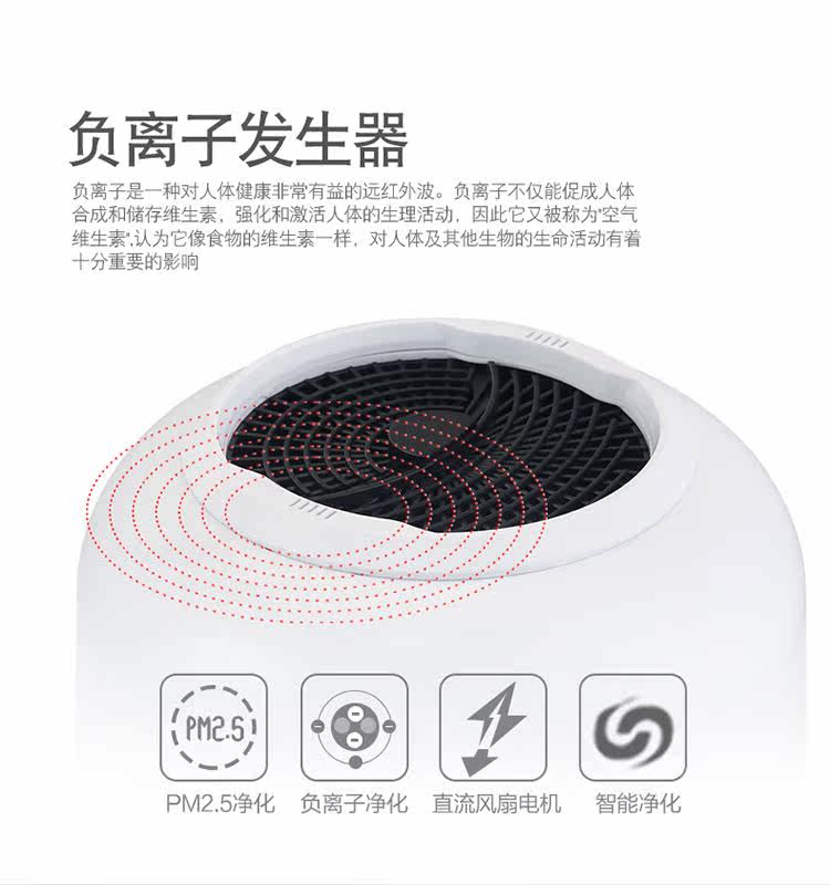 • 功能:定时 除花粉 除颗粒物 除甲醛 除烟除尘 杀菌 加湿 除雾霾 除菌, 负离子 除菌