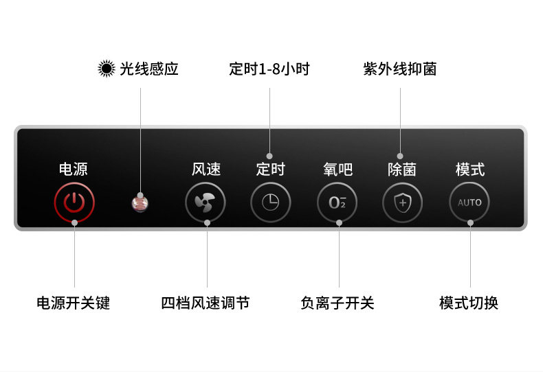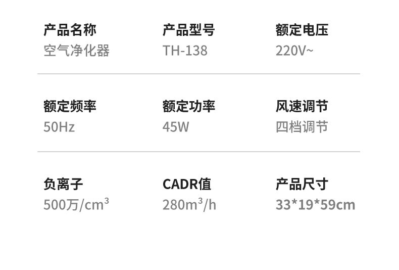 • 功能:定时 除花粉 除颗粒物 除甲醛 除烟除尘 杀菌 加氧 除雾霾 除菌, 负离子 除菌