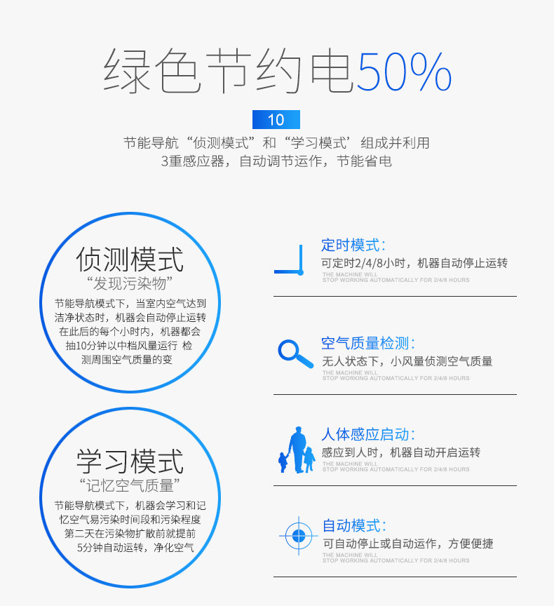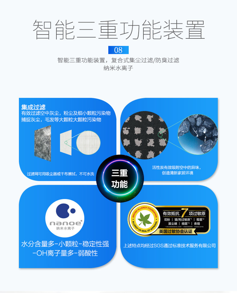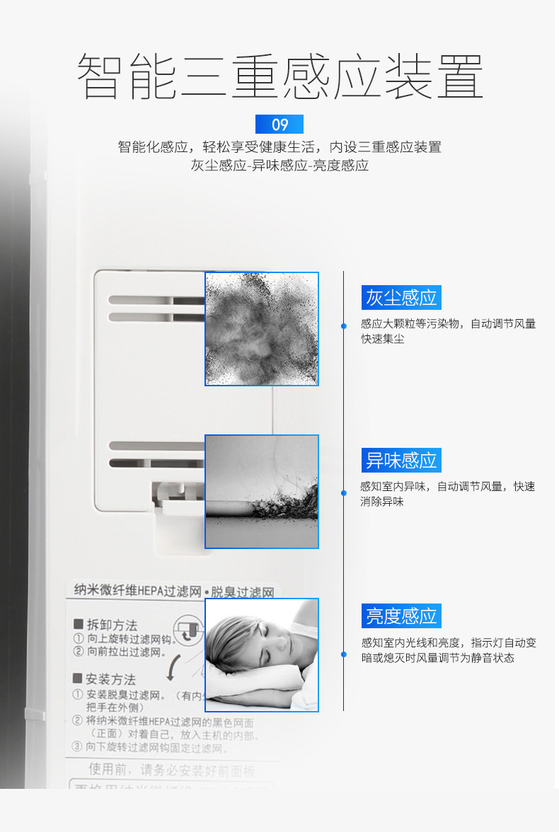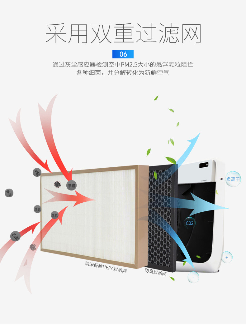 • 工作原理:HEPASilent专利技术 活性炭 负离子 HEPA技术 光触媒