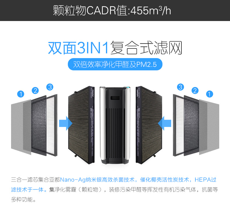 • 功能:除花粉除颗粒物除甲醛除烟除尘杀菌