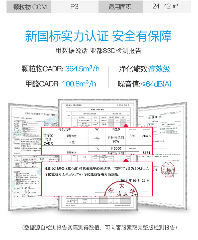 • 甲醛CADR值:100立方米/小时