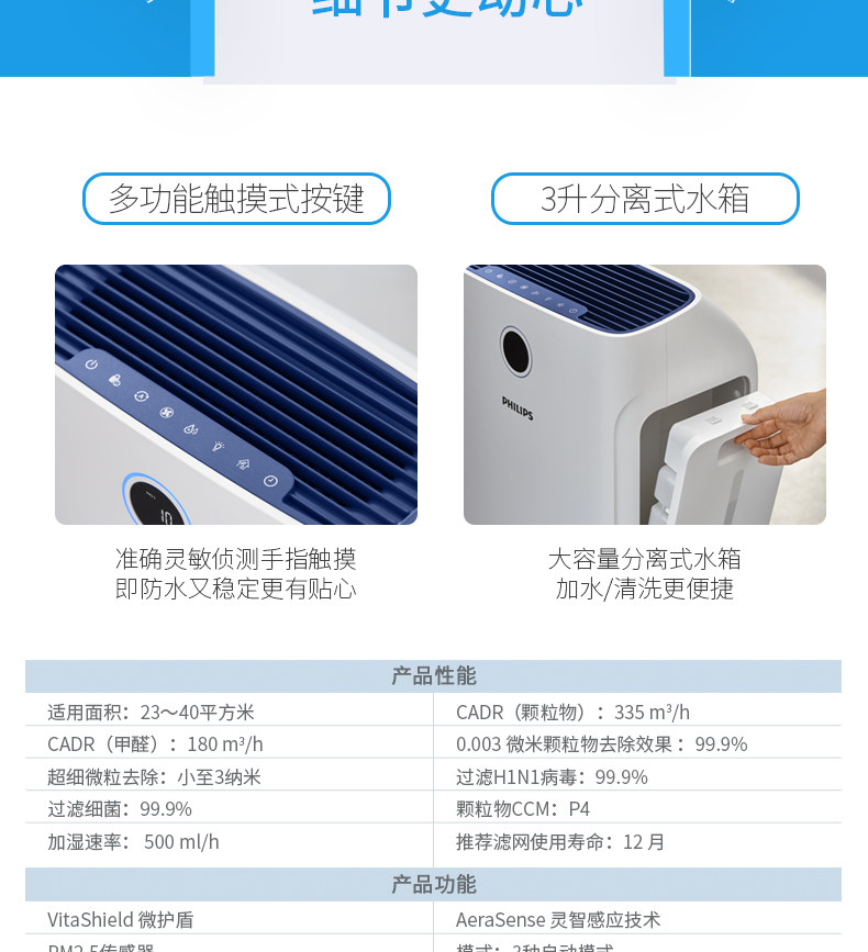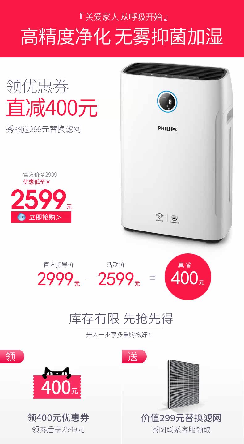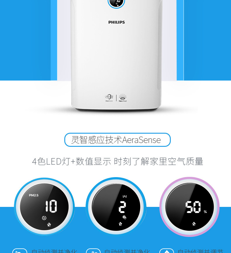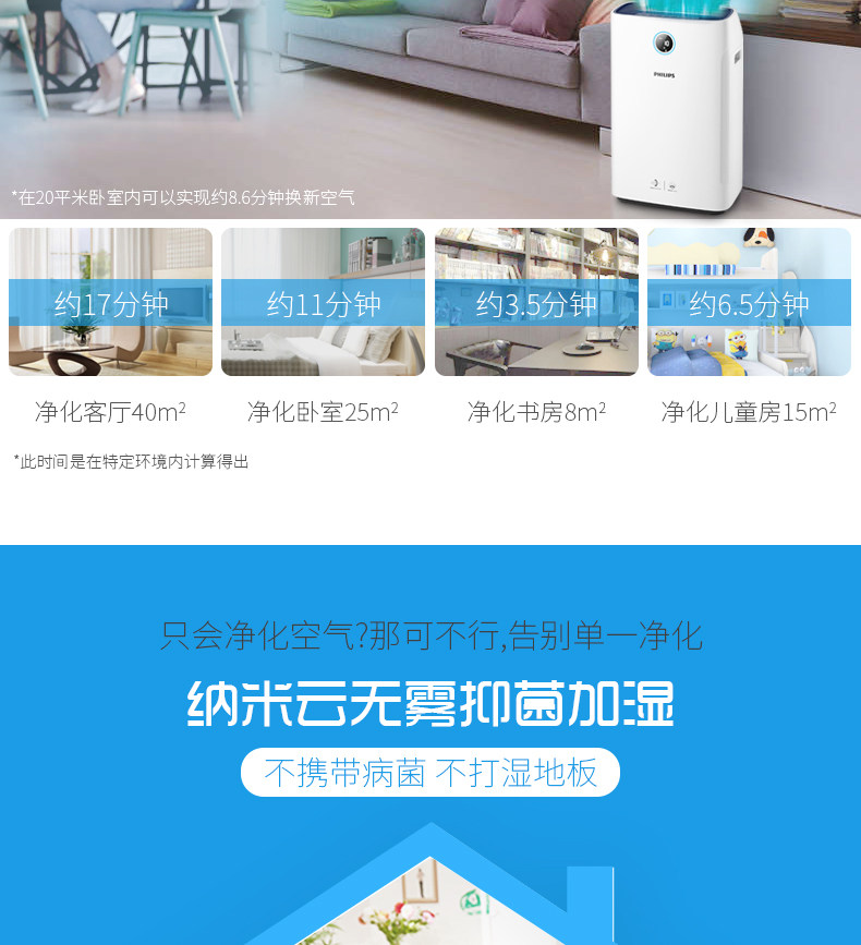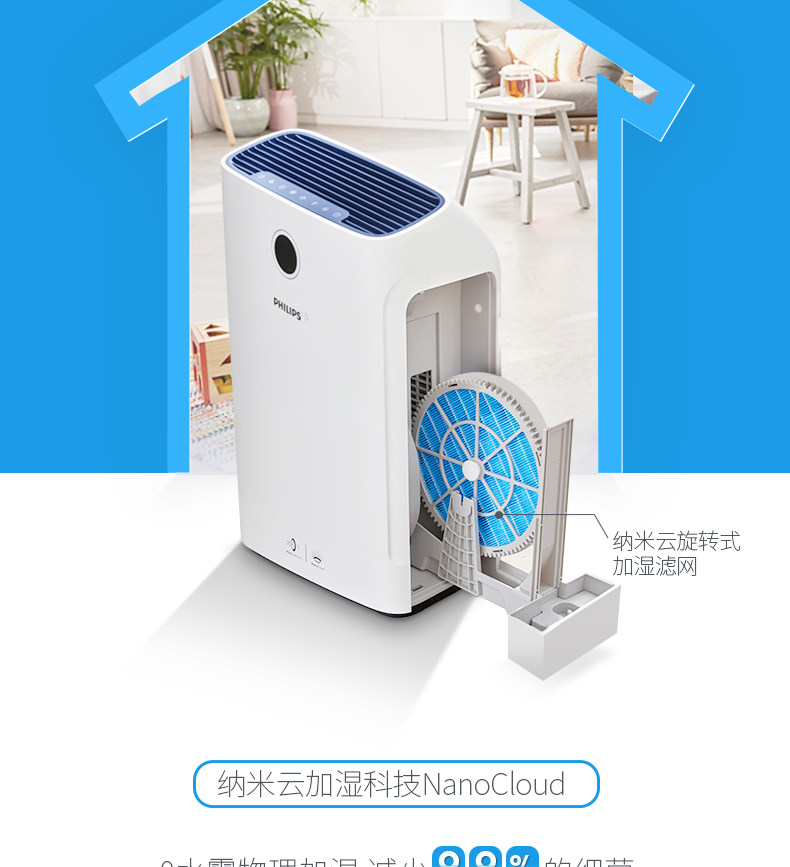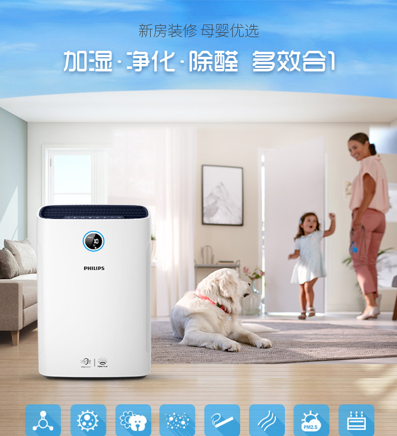 最近一直咳嗽好不了,感觉是搬了新房子空气质量不好,想买一台加湿器,还想买台空气净化器,听说菲利普的不错,前天晚上在这家店查到有净化加湿二合一的,而且不喷雾,是空气循环均匀加湿,防止壁布和实木地板损坏,买下后自己按说明书安装好,放在卧室里立即启动试验,刚通电自动检测室内空气确实不好,光圈显示粉红色,空气也干燥,开机后半小时光圈显示蓝色,代表空气质量变好了,空气湿度也在上升,我设置到了60%,湿度达标加湿会自动停止,还设置了抗过敏源净化,现在卧室里空气感觉特别清新!计划再买一台放在客厅里。