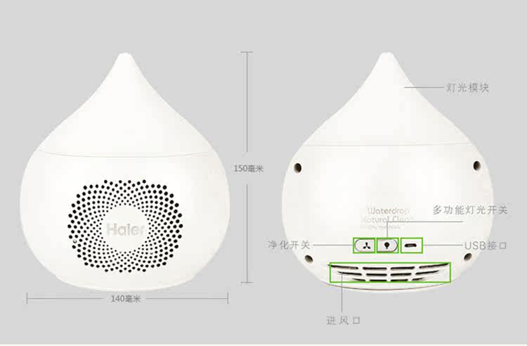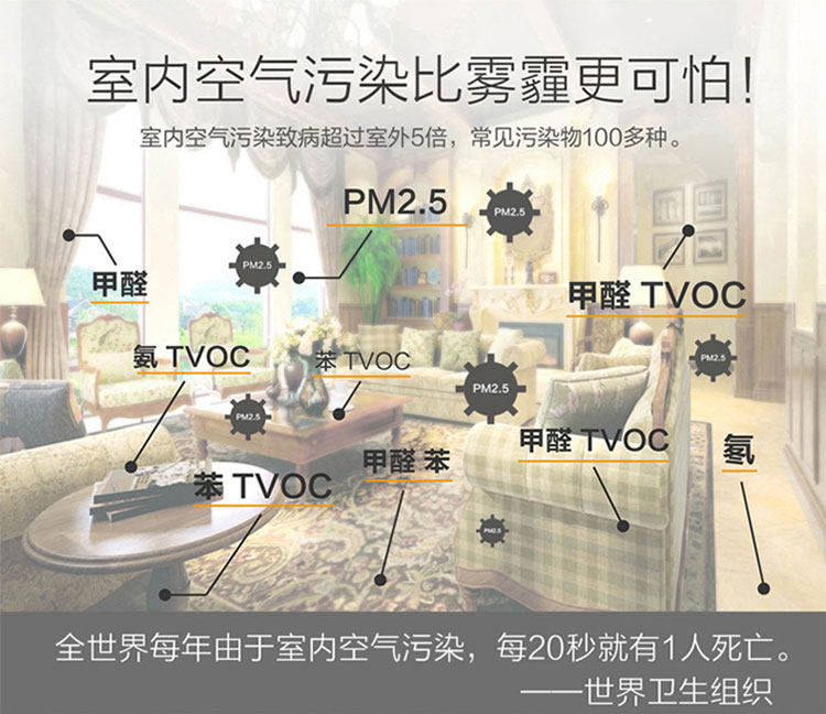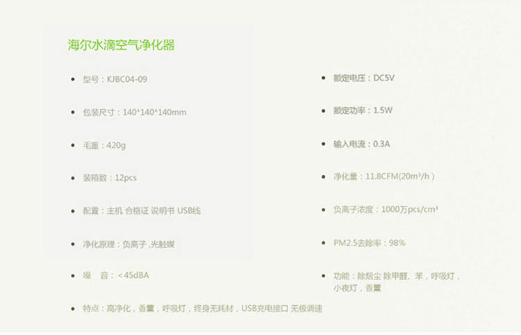 • 功能:除VOC 除花粉 除颗粒物 除甲醛 除烟除尘 杀菌 除雾霾 除菌, 负离子 除菌