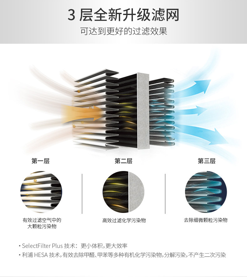 • 净化原理:HEPA滤网 静电吸附