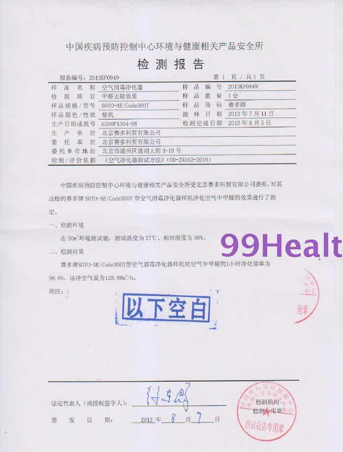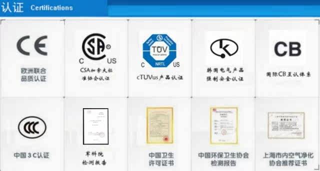 在中国取得中国卫生部消毒器械的许可和卫生许可,2010年在韩国产业技术检测院(KTL)对同类众多知名品牌产品的官方测试中,各项净化效果——除甲醛、除极细小颗粒物PM1、除TVOC、除菌——均排名第一!