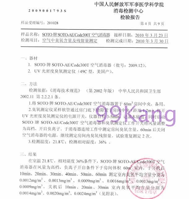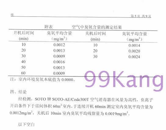5. SOTO空气消毒净化器可以有效去除空气中99%以上的有害细菌,并且开机状态下空气中的臭氧含量不升反降(见如下《军科院300T检测报告》节选):