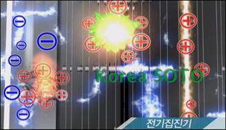 第二层:静电吸附装置,利用强力的高压电流把空气中直径小至为0.01微米极细小颗粒物、螨虫及微生物吸附到机器的负极上并烧灭其中的螨虫及微生物,防止其在吸附装置上继续繁殖并重新随着送风回到空气中;
