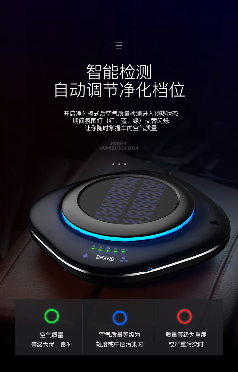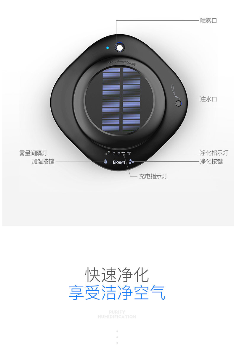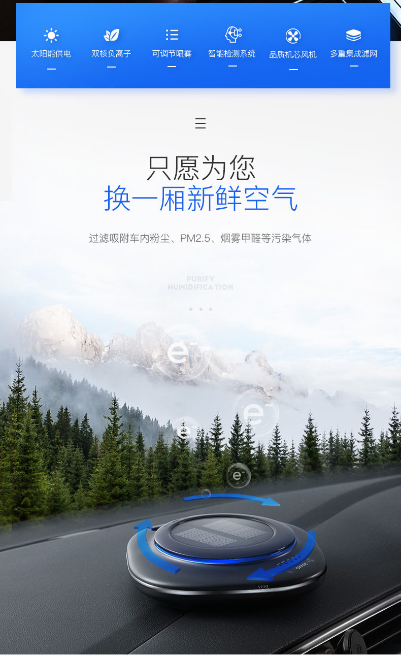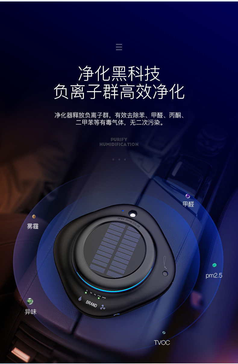 太阳能车载空气净化器汽车用内负离子消除异味甲醛香薰加湿器喷雾