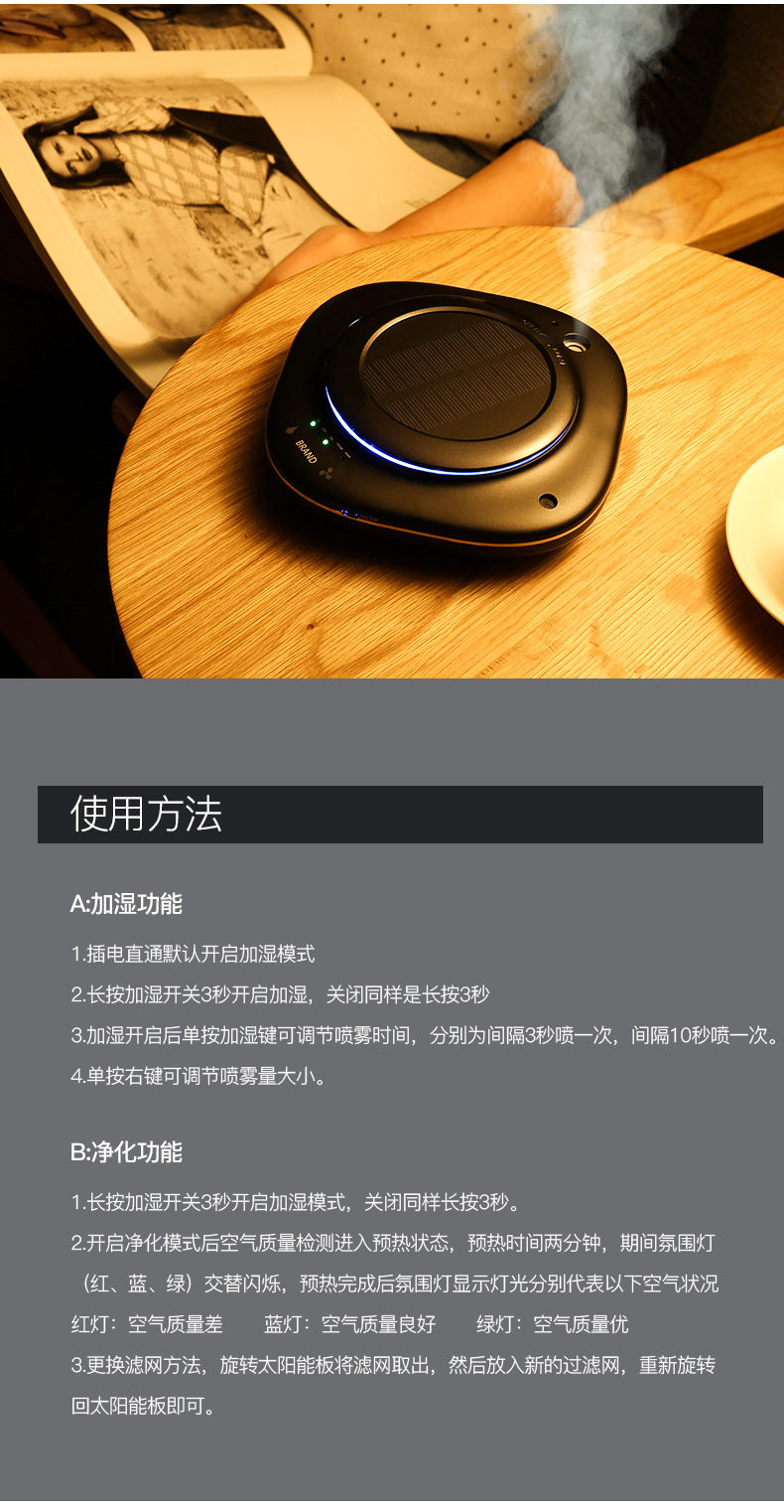 • 净化原理:HEPA滤网 活性炭 等离子
