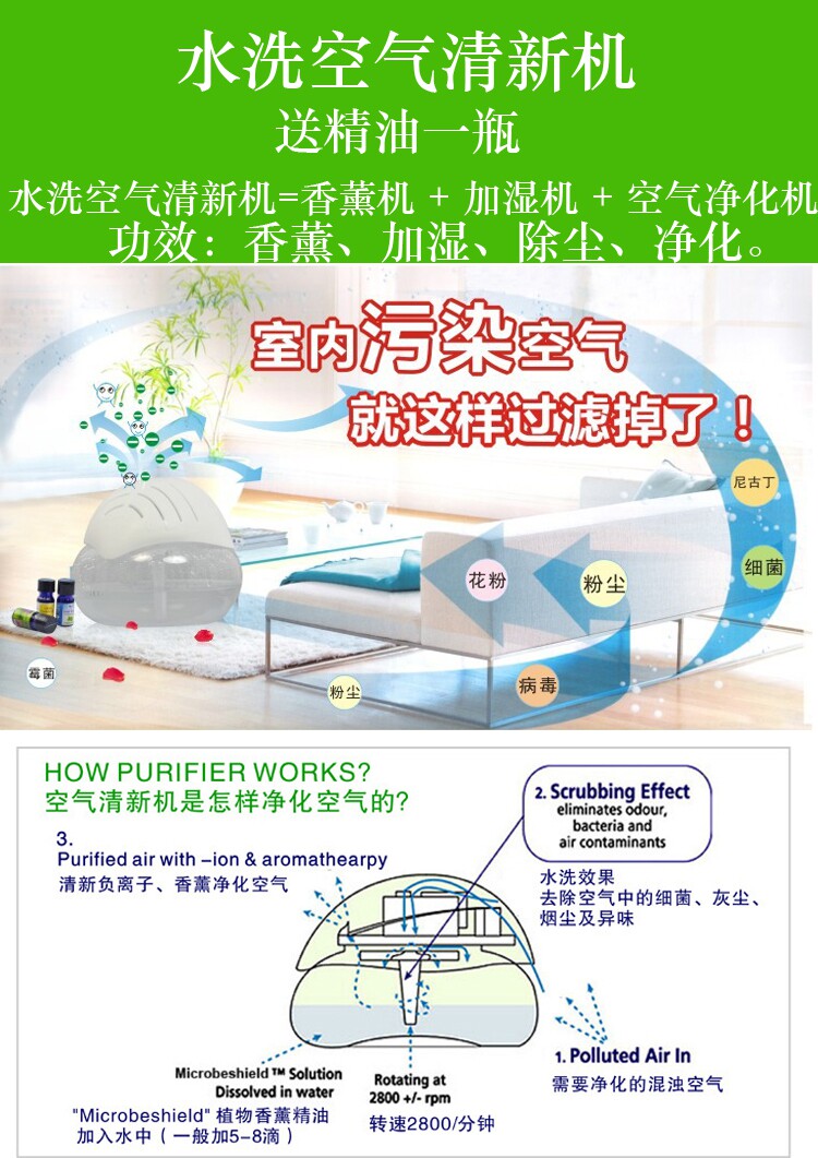 水洗空气清新机是引进新加坡技术,微孔螺旋结构吸入室内气体,将空气中有害物质吸附水中,处理后无害