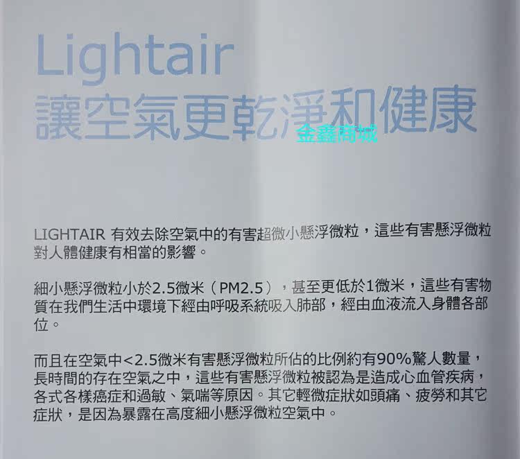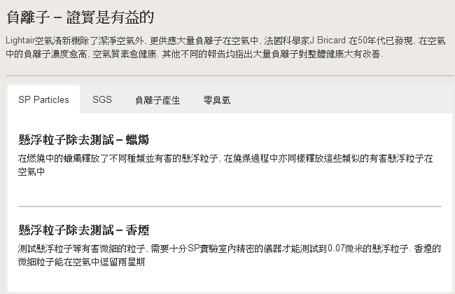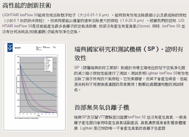 SP(隸屬瑞典政府工業部)對處於市場主導地位的若干空氣淨化器的減少細小微粒性能進行了測試。測試表明Lightair IonFlow 50有效地去除了幾乎所有的大氣微粒。它實際上同市場上最好的帶有高效空氣過濾器的空氣淨化器一樣好,但其不會產生噪音、能源消耗和更換過濾器的昂貴費用!