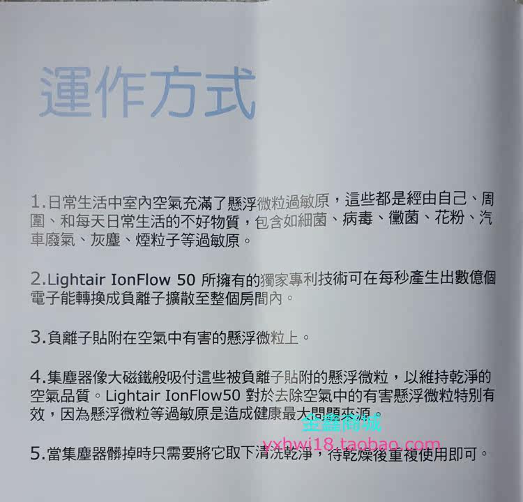 Lightair IonFlow 50 空氣清新機擁有獨家專利技術, 裝置在最上方的位置有3根突起的電暈針, 可每秒產生數百萬顆負離子擴散至整個室內. 室內每立方公分(CM3)的負離子濃度可達250,000顆(於1米距離量度). 但卻不會像一般的負離子產生器, 會產生有害健康的臭氧(ozone)。