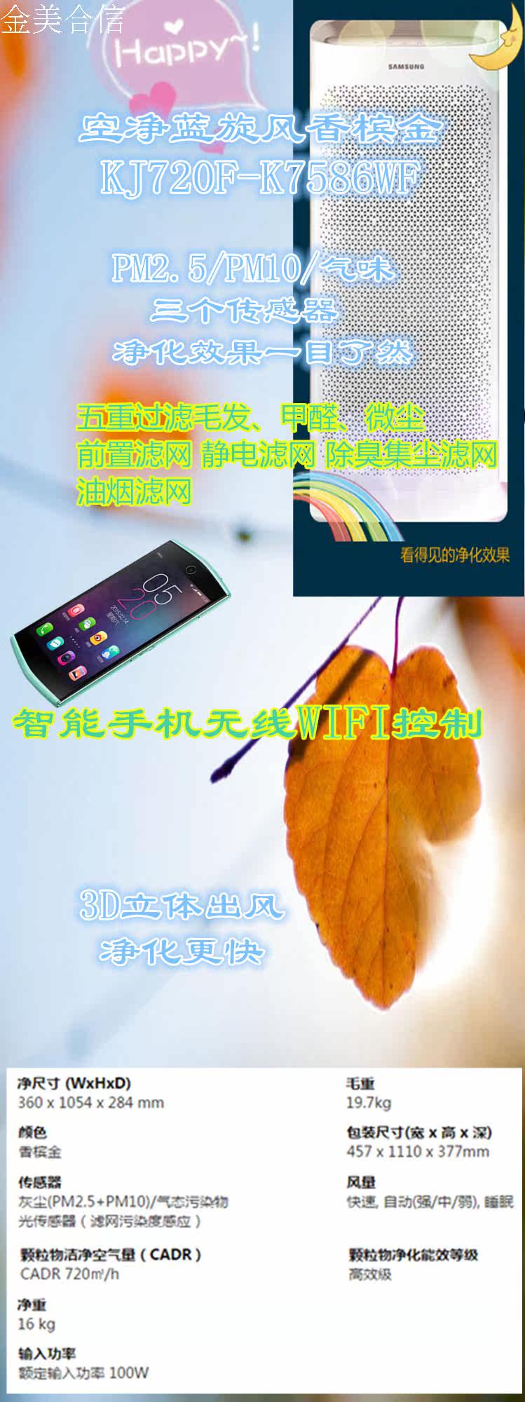 三星空气净化器KJ720F-k7586WF除雾霾甲醛病菌,超长效HEPA滤网延长使用时间2倍,HCHO强化滤网,过滤效果增强2倍; 滤网寿命提示,3个独立传感器,PM2.5/PM10/气味浓度独立显示,多种模式。韩国原装进口。除霾增强型。有静电除尘装置和WIFI。全国联保。高于国家GB/T 18801-2015《空气净化器》标准。