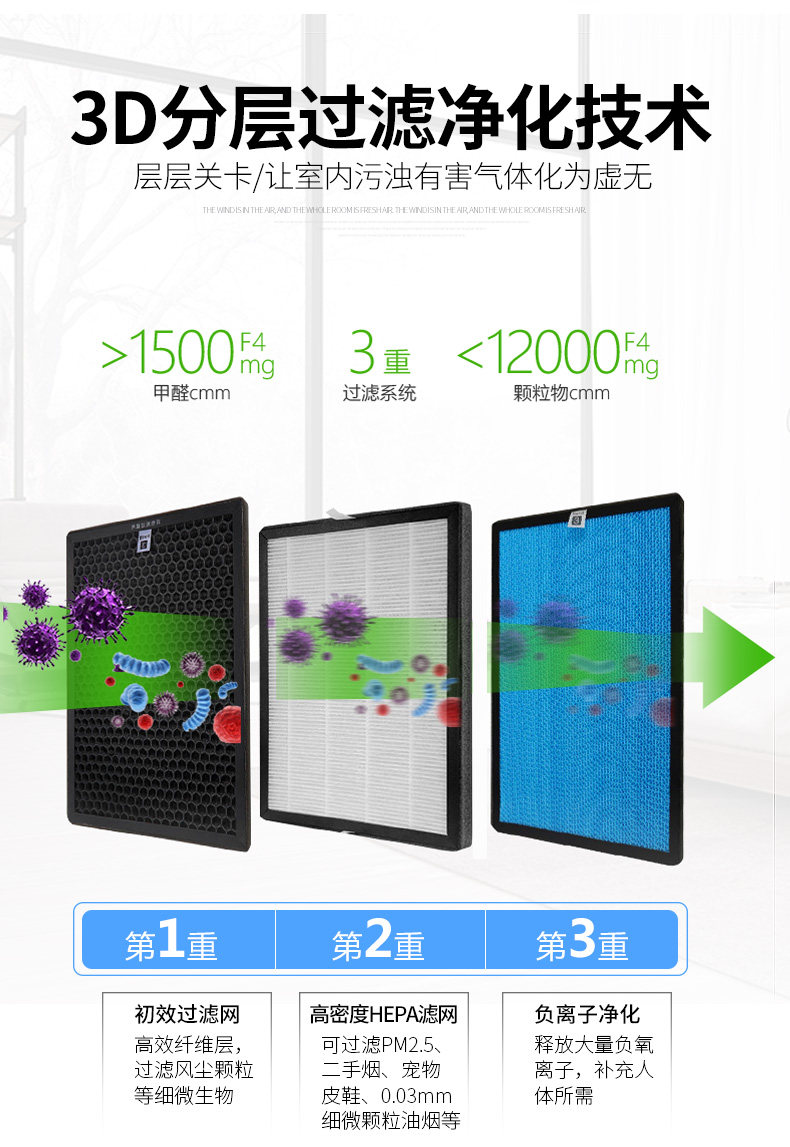 • 工作原理:活性炭 负离子 HEPA技术