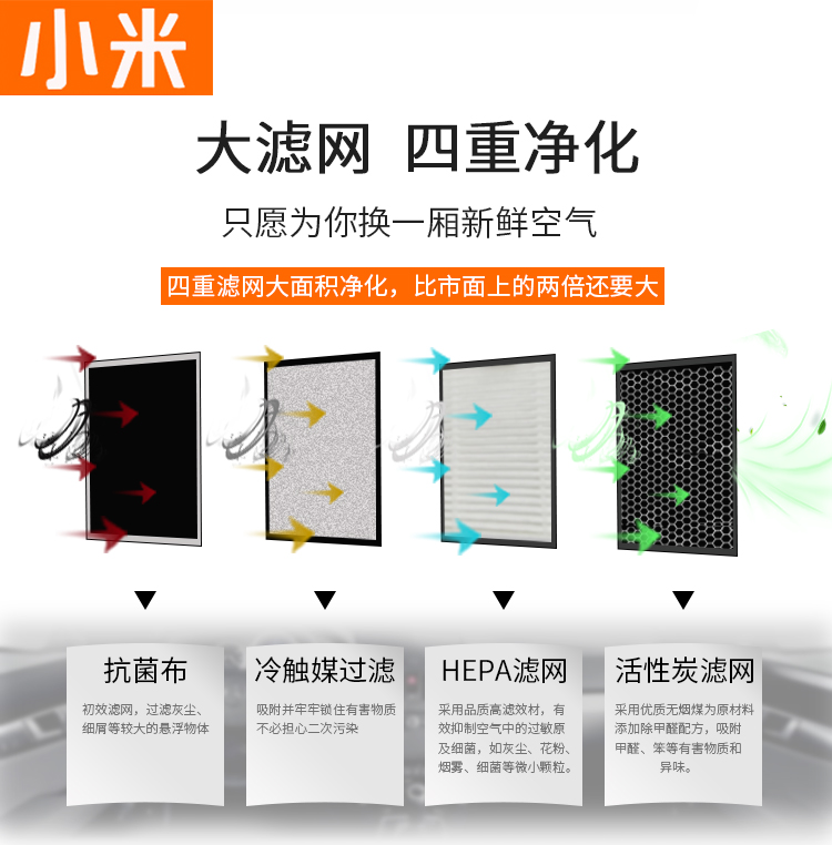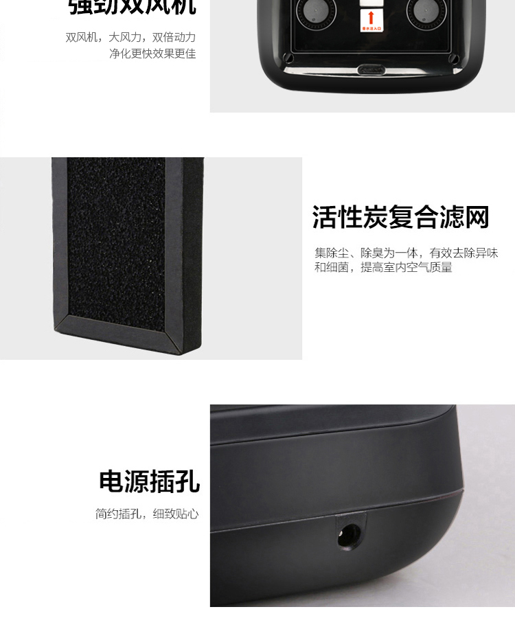 • 净化原理:HEPA滤网 光触媒 活性炭 等离子 负离子 静电吸附