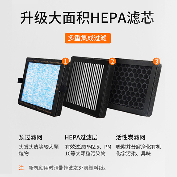 • 净化原理:HEPA滤网 光触媒 活性炭 等离子 负离子 静电吸附