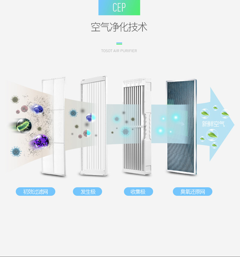 • 工作原理:静电技术 等离子 臭氧