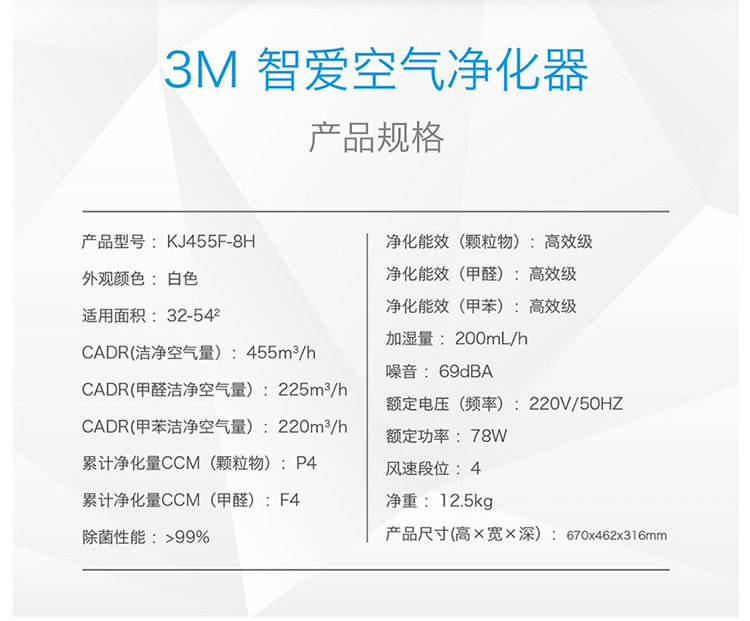 3m 空气净化器家用除甲醛 智能除菌母婴款 白色 KJ455F-8H 带加湿