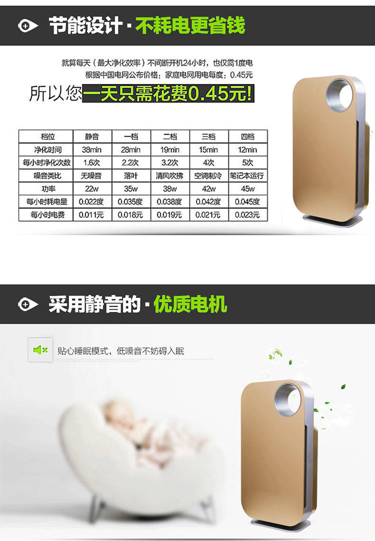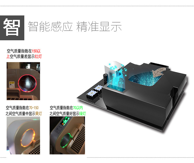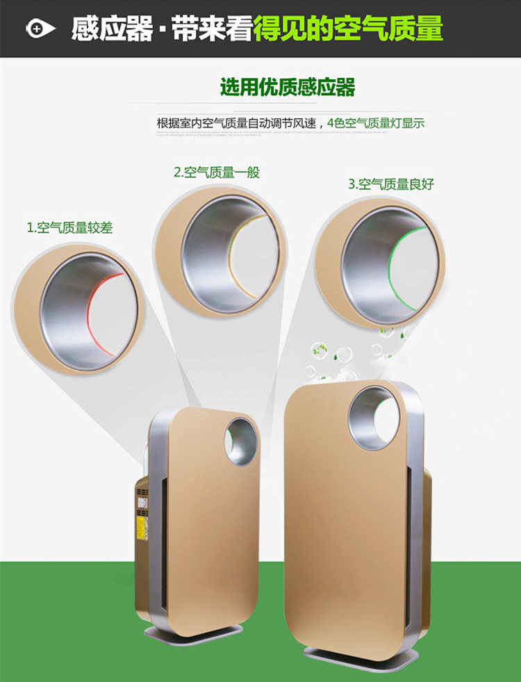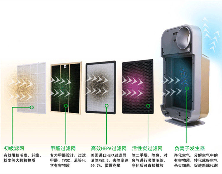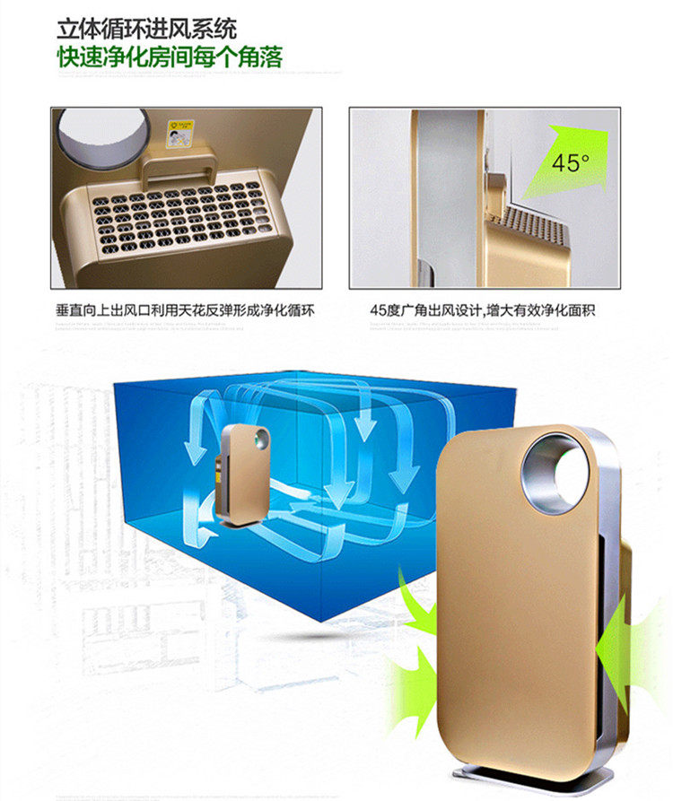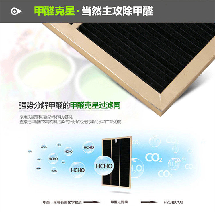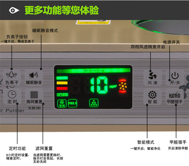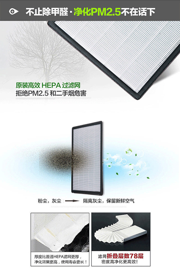 1,专用甲醛克星过滤网,分解新家装修甲醛。2,五道重净化过滤,给您健康空气。3,静音电机,安静似无声。4,PM2.5空气质量数字显示,空气状况一目了然!5,创新甲醛猎手按钮,一键除甲醛!