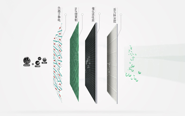 • 净化原理:HEPA滤网 活性炭 负离子 静电吸附