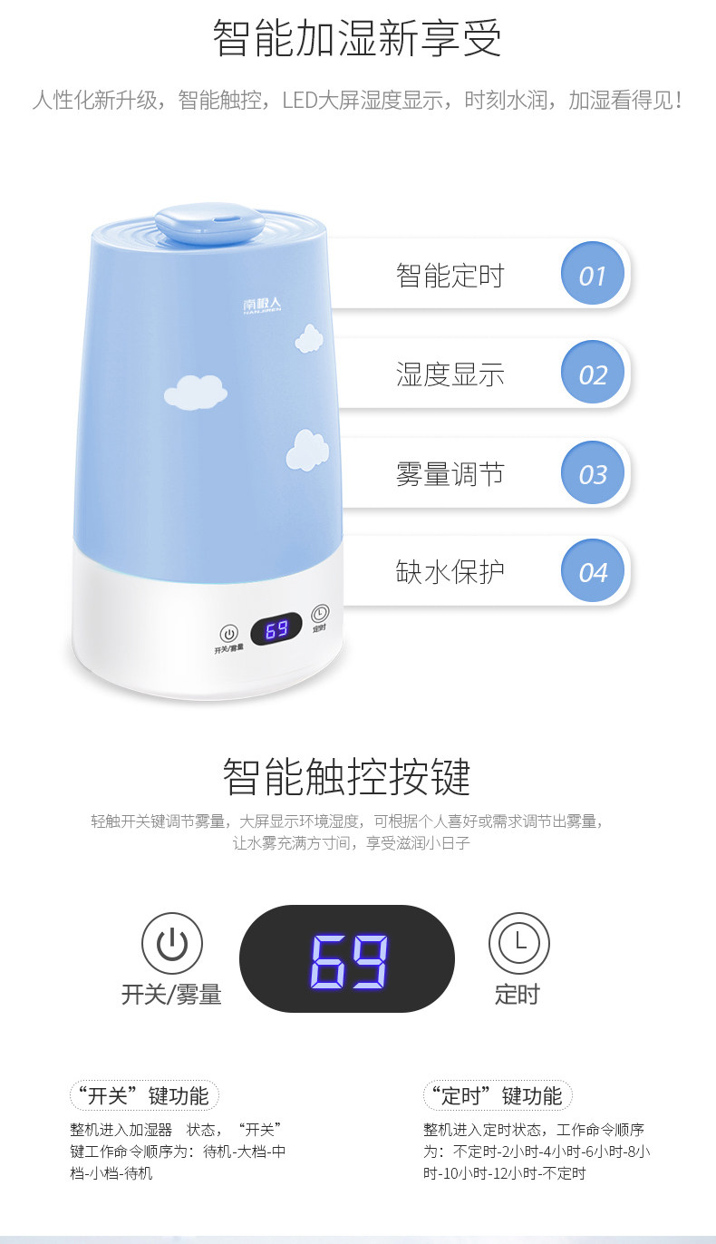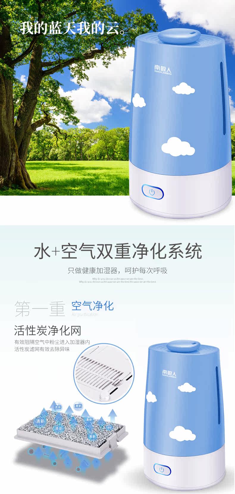 第一次买加湿器,看了好久才决定买南极人的。产品无噪音,小巧,可爱,很精致呢。