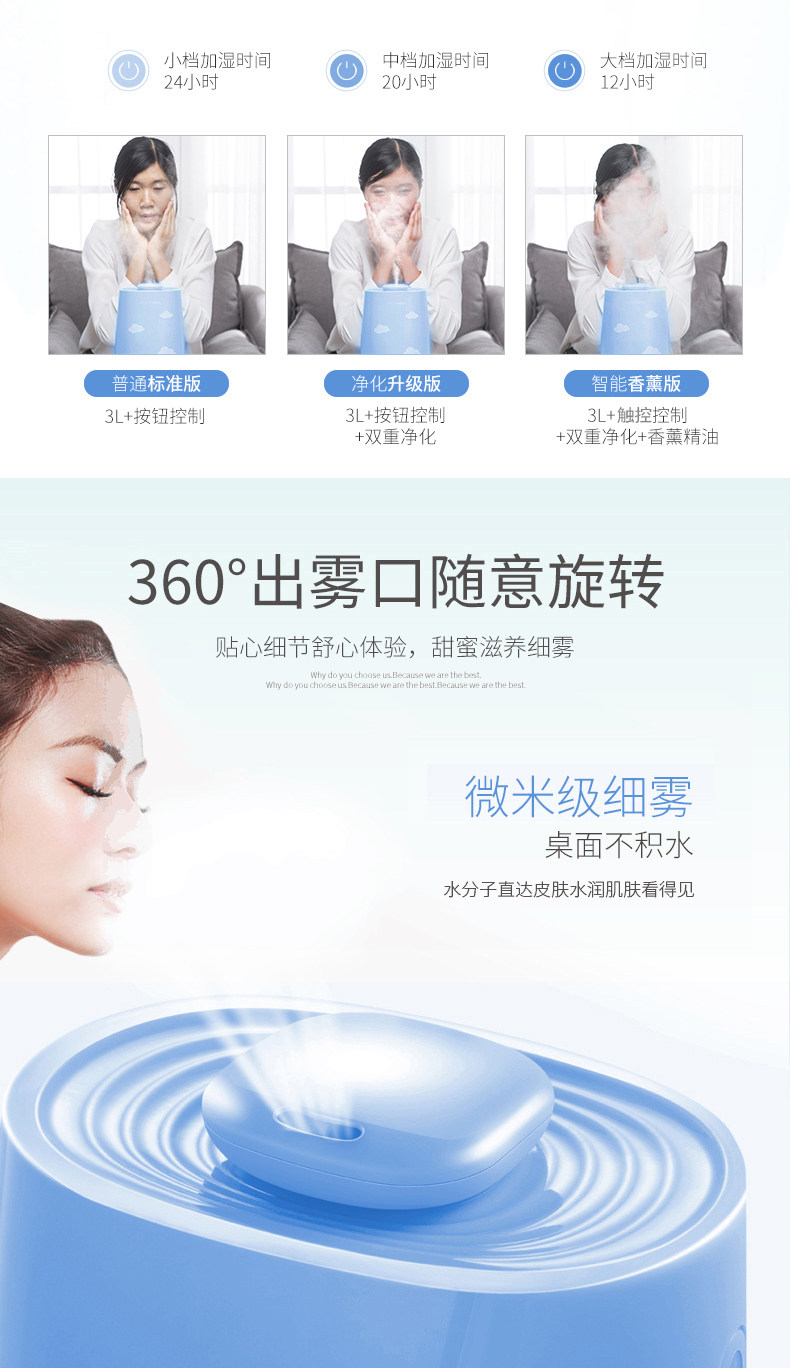 自己家生的暖气,屋子里太干,就想着买台加湿器,选来选去挑了这家店,真是没有让我失望,雾气很大,三挡调节,可大可小,加满水用中档的话12小时用不完,加水也很方便,噪音不大,适合有孩子的家庭使用,总体来说很不错,好评,