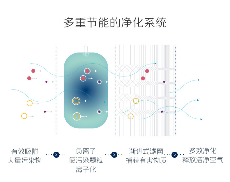 • 工作原理:静电技术 活性炭 负离子 HEPA技术