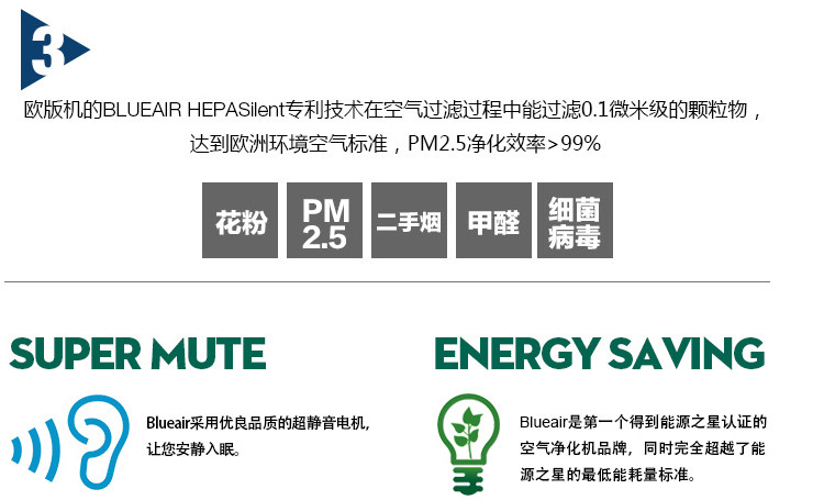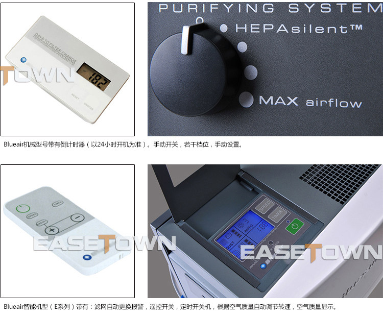 |    403(手动机型,配倒计时器,可额外配滚轮)      1、Blueair是空气净化机是市场上得到AHAM认证,获得高CADR值并具备高性能的空气净化机品牌。 2、专利的HEPASilentTM技术 由于独特的HEPASilent过滤技术,Blueair产品是空气净化机市场中安静的机械式过滤空气净化机。 3、高质量产品及零配件 Blueair产品的外壳是由合金钢制造的,相比塑料而言更加耐久可靠。 4、节能低耗 Blueair是所有产品都获得能源之星认证的品牌。24小时连续运转,耗电量约为0.5度。 5、获得最佳瑞典设计奖 其圆滑弧度并极具现代感的设计可以融入各种室内装修。 6、简易更换过滤网 不需要任何工具。仅需几秒就可以完成更换。 7、零排放 Blueair空气净化机不仅可以去除空气中的污染物,其最主要的另一个好处是它不会产生任何副产品如臭氧。Blueair的所有产品都通过了美国加利福尼亚州空气资源委员会(ARB)的认证,该认证对检测空气净化机排放臭氧的标准是严格的。  E系列和非E系列的区别:E系列为智能机型。能全程智能监控方便您的使用!可遥控选择风速,也可调为自动模式,让机器根据空气质量自行选择风速,并备有滤网更换智能提示,带空气检测提示,定时开关机。 什么是pm2.5? Pm2.5是指大气中直径小于或等于2.5微米的颗粒物,也称为可入肺颗粒物。它的直径还不到人的头发丝粗细的1/20,但它对空气质量和能见度等有重要的影响。与较粗的大气颗粒物相比,PM2.5粒径小,富含大量的有毒、有害物质且在大气中的停留时间长、输送距离远,PM2.5是一种载体,本身可以带病菌,它被吸入肺泡之后随之进入血液,因而对人体健康和大气环境质量的影响更大。 为什么要用空气净化机? 一般情况下,一个人每天需摄入1公斤的食物,饮2公斤的水,呼吸32公斤的空气。据美国环保署的研究,人们在室内呼吸到的空气污染程度是室外空气的2-5倍,有时甚至高达100倍,而现代人几乎90%的活动都是在室内进行的。这些污染物是由于室外的汽车尾气,工业废气等随着窗户的打开进入室内,空气会从缝隙等地方出去,但是大量的颗粒物会留下。由此长时间呼吸被污染的室内空气可以引发人头痛、眩晕、昏厥,刺激人的眼耳口鼻,甚至引发难以治愈的过敏及哮喘等呼吸道疾病,室内空气污染已经成为人类不容忽视的隐形杀手。为解决室内空气污染问 题,美国环保署(EPA)推荐使用空气净化机。 用什么标准来衡量净化机的好坏? 首先看CADR值,这个数值是一个综合的衡量标准。数值越高,机器的总体性能越好。 Blueair 使用了多层渐进式HEPA网和静音悬浮风机。平衡了高效和静音这两个矛盾体。 多层渐进式滤网没有那么稠密,但 又不是很薄,减小了空气通过的阻力,从而降低了噪音。风机降低了大风机的能耗。 综合评价Blueair达到了行业内性能优秀。 HEPA代表什么? HEPA是英文High Efficiency Particulate Air的缩写,意思是高效空气过滤。达到HEPA标准的过滤网,对直径为0.3微米以上的微粒去除效率可达到99.97%以上,是烟雾、灰尘以及细菌等污染物有效的过滤媒介。Blueair专利的HEPASilentTM(高效无声过滤)技术可以有效清除通过滤网的0.1微米以上大小的悬浮粒子达到99.97%。 为什么Blueair不会产生臭氧? Blueair的机器很多人都了解是多层渐进式滤网和静电吸附相结合的方式,行业内的其他静电技术都是利用正负极的高压产生静电,电压高达8000-12000伏,这种高压静电的电离作用会产生大量的臭氧。而Blueair利用静电毛刷(离子发生器)使空气中的颗粒物带负电,而滤网(聚丙烯材质)本身带磁性,污染物就吸附在我们的滤网上,并且渐进式的拦截,达到净化的功效。电离确实会产生很少量的臭氧,blueair同时还使用封闭的钢罩包裹离子室,臭氧分子在离子室内与钢碰撞的时候,其中很多的第三个氧原子就碰掉了,因而又变回到原来的一般的氧,不再是臭氧了。所以这样的方式是不会产生臭氧。Blueair静电系统对健康没有威胁,即使对于那些有呼吸系统疾病的人都毫无妨害。 使用空气净化机会降低免疫力吗? 使用空气净化机不但不会降低人体免疫力,而且将促进人体免疫力的自我修复。 首先免疫力下降主要是由于各种压力,空气污染、食用不健康食品等因素导致人体亚健康的产生。但人体是具有自我修复能力的,所以如果能够在清洁的空气环境中生活工作,您身体的自我修复将得到重要的帮助。 晚上睡眠和休息的时候是人体自我修复排出毒素的最佳时间,也是人体免疫系统最低迷的时间,如果您能伴着洁净的空气入睡,将更有利于您身体的自我修复及睡眠质量,长此以往也将有助于人体免疫力的恢复和提升。 你们的机器可以24小时持续开机吗? 当然可以!我们建议您24小时开机,因为空气中的污染物是在不断的产生,比如甲醛,TVOC,毛发等。另外,Blueair采用的是静音悬浮电机,专供航空、医疗和通信行业。连续工作50000小时不用关机,使用寿命长达10年以上。  欧洲的品牌讲究性能和质量,日韩品牌为了迎合消费者注重外观;中国品牌看重成本。 Blueair的技术,材料,制造工艺都比较讲究,制造成本比较高,如:外壳采用合金金属外壳,外面烤漆,坚固牢靠,比其它品牌采用的塑料外壳高档的多。电机采用静音悬浮电机,可以24小时连续运转10年以上,就这点没有几个品牌可以做到;为了降低噪音,甚至在风扇叶片上做了动平衡处理。种种措施,所以售价也略微高一些,但性能和质量无可挑剔,全