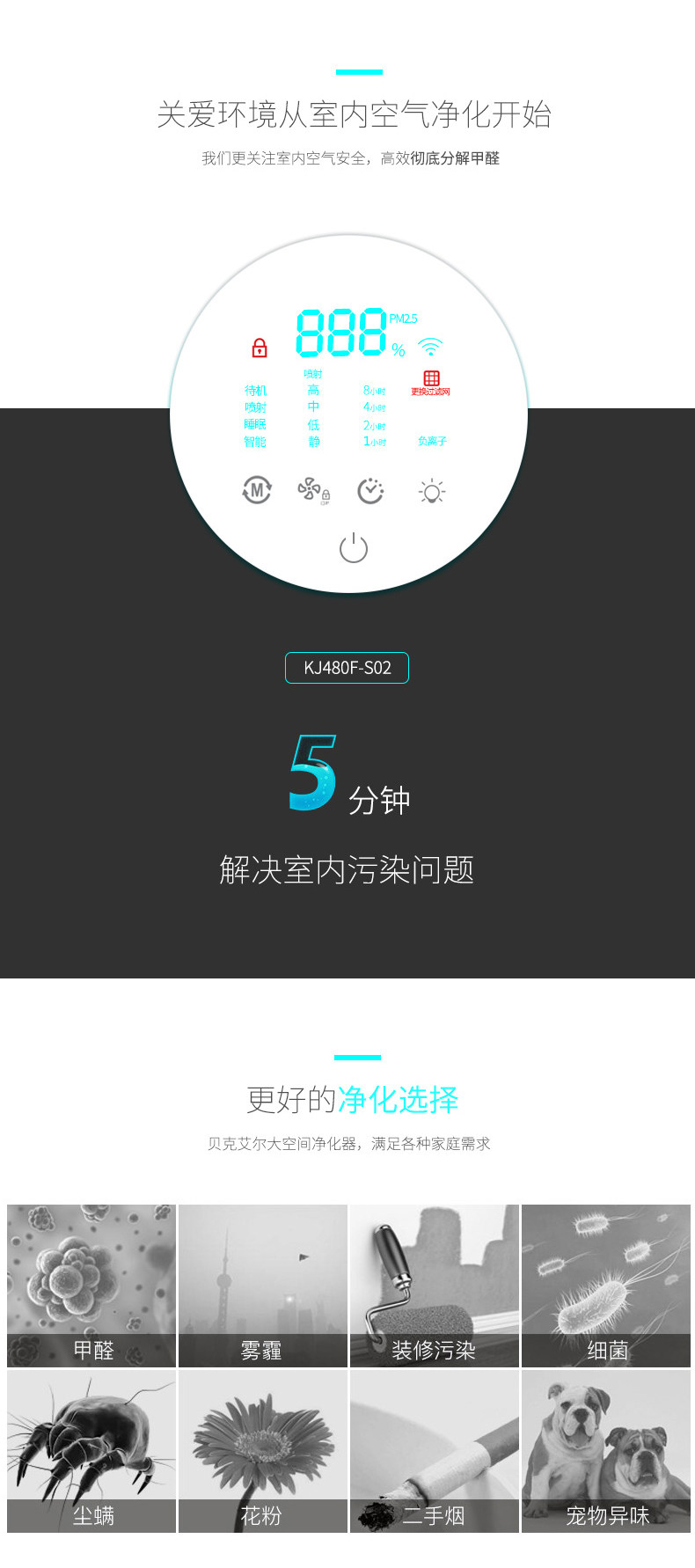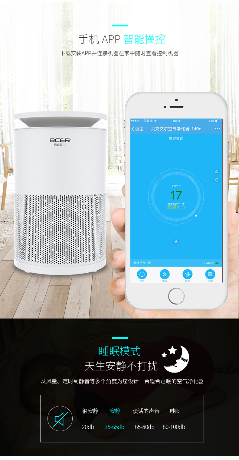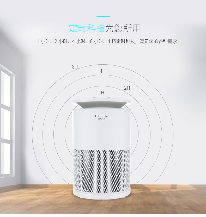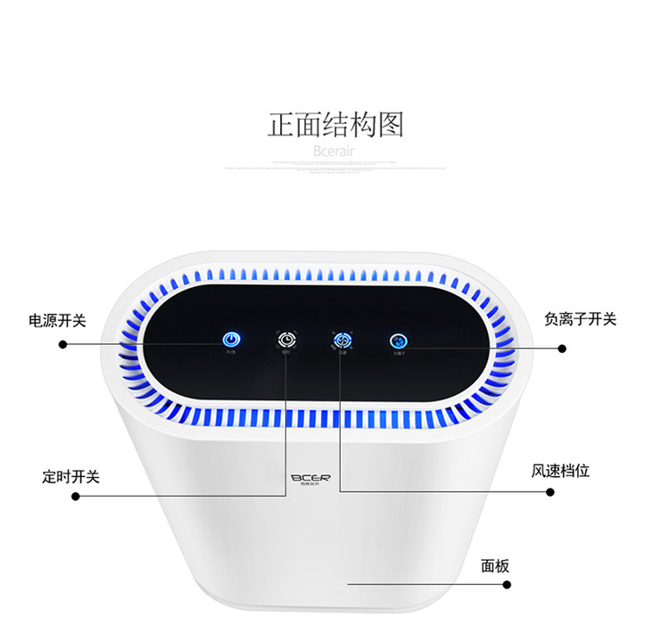 • 功能:定时 除VOC 除花粉 除颗粒物 除甲醛 除烟除尘 杀菌 除雾霾 除菌, 负离子