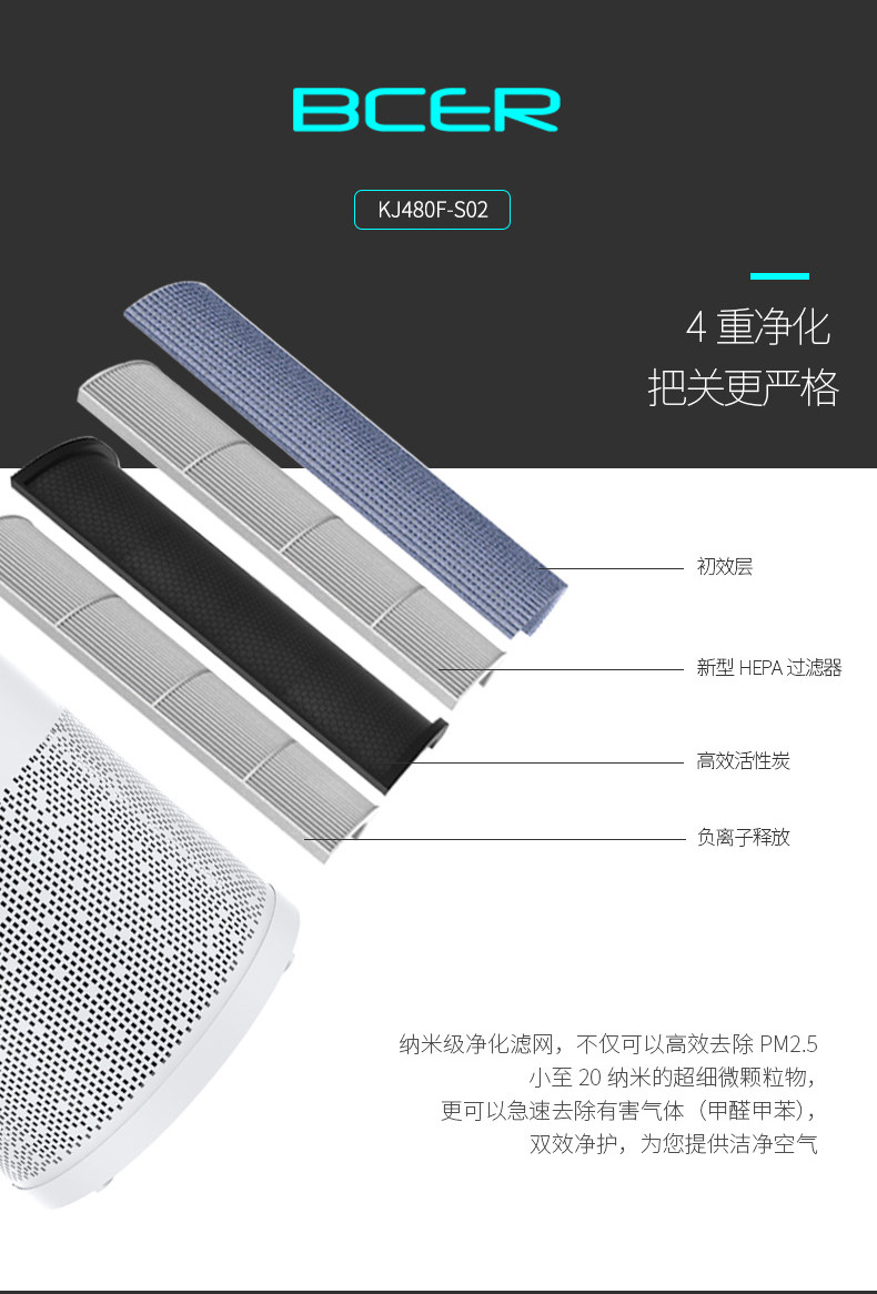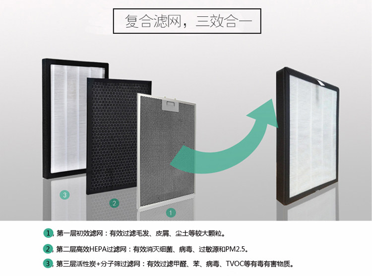 • 工作原理:活性炭 负离子 等离子 HEPA技术 紫外线