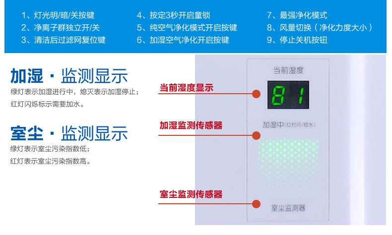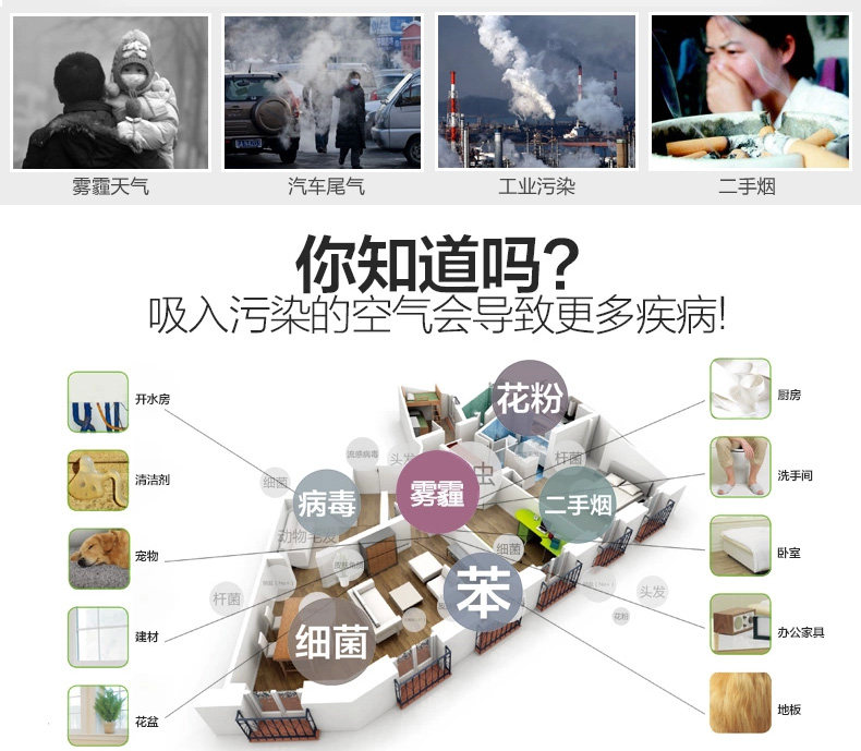 • 功能:除甲醛除烟除尘杀菌加湿