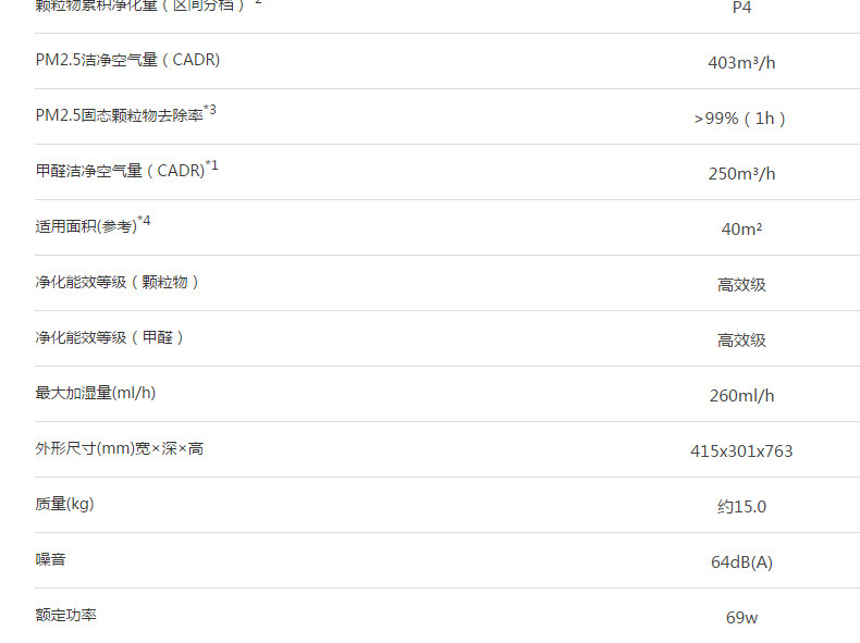 • 甲醛CADR值:250立方米/小时