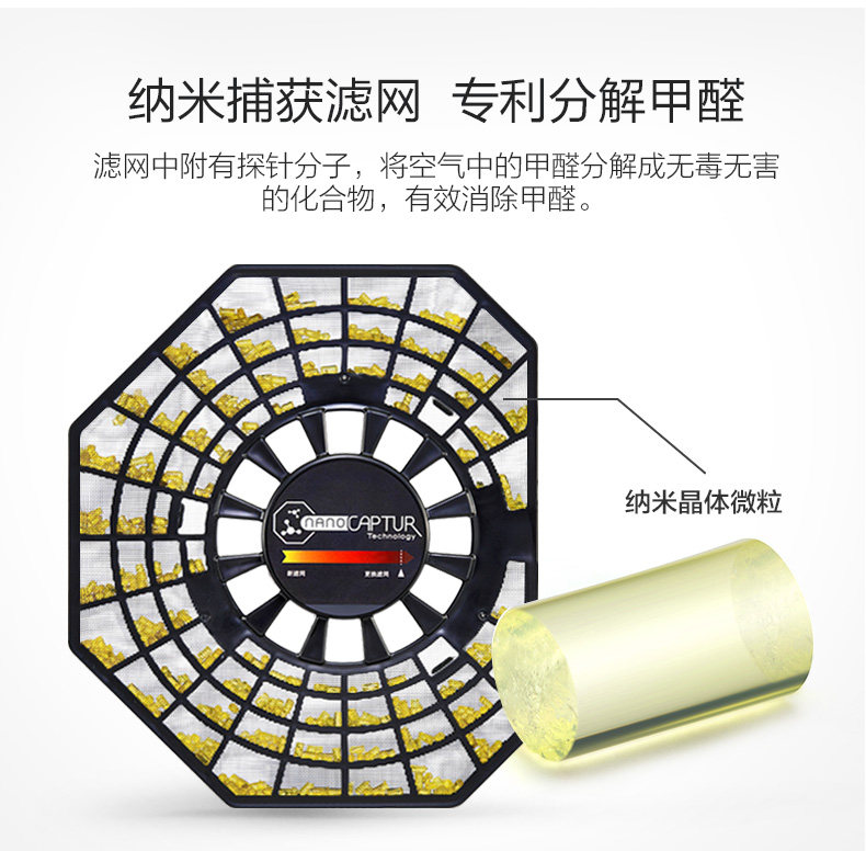 • 工作原理:静电技术活性炭负离子HEPA技术