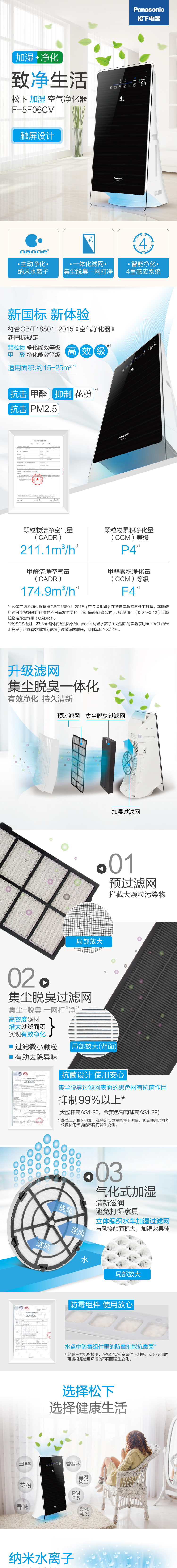 松下空气净化器家用加湿除雾霾PM2.5 纳米水离子 F-5F06CV黑色