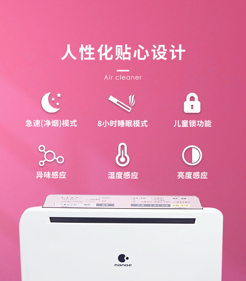 • 功能:定时 除VOC 除花粉 除颗粒物 除甲醛 除烟除尘 杀菌 加湿