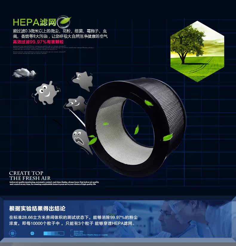• 工作原理:活性炭 负离子 HEPA技术