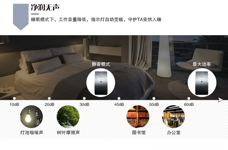 我对比了非常多家的净化器,想选一个带加湿器功能的,最终选了这款,很满意,非常静音,你做事的时候根本感觉不到他的工作,加湿可以把室内湿度提升到50%,也是效果不错的,我用湿度计测的